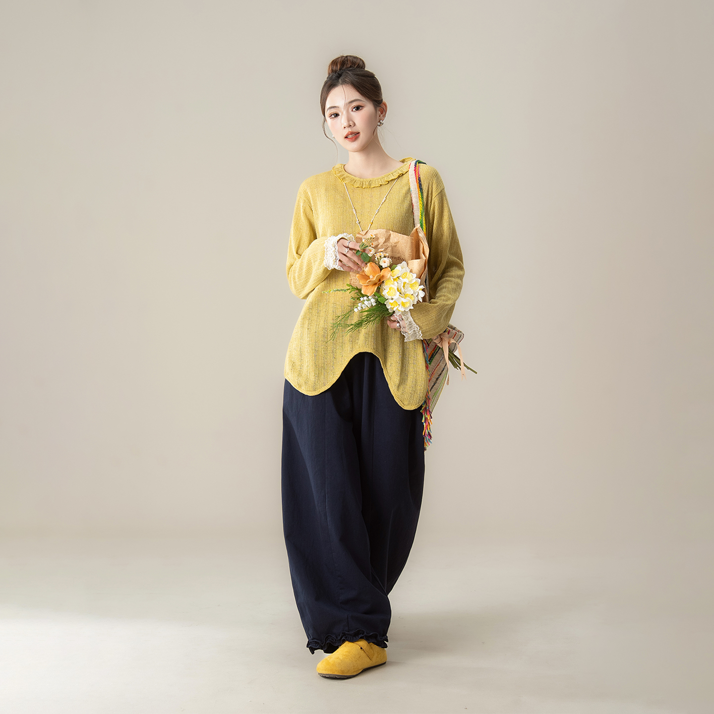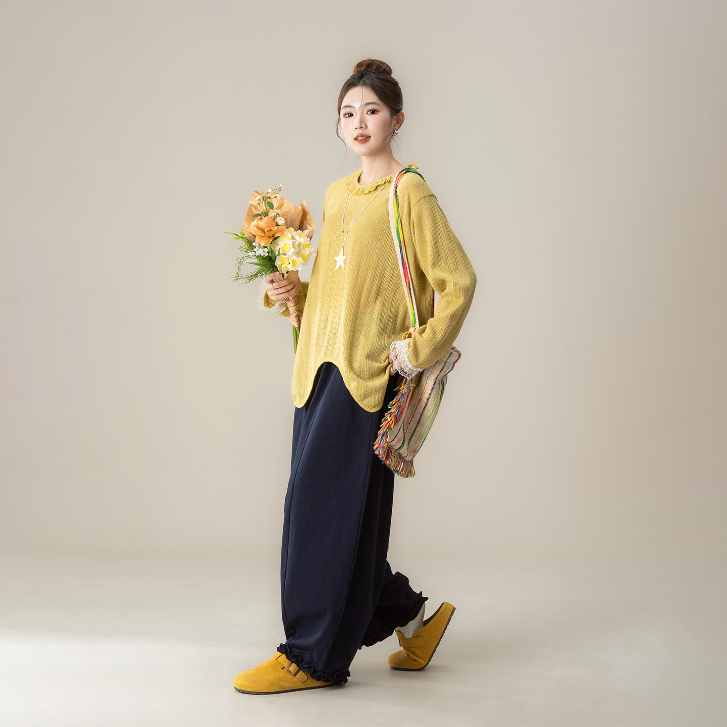 不规则蕾丝拼接设计感打底衫 新款 上衣 T恤女秋季 黄色花边圆领长袖