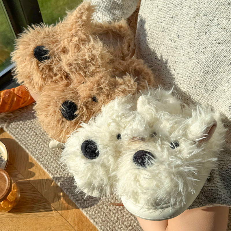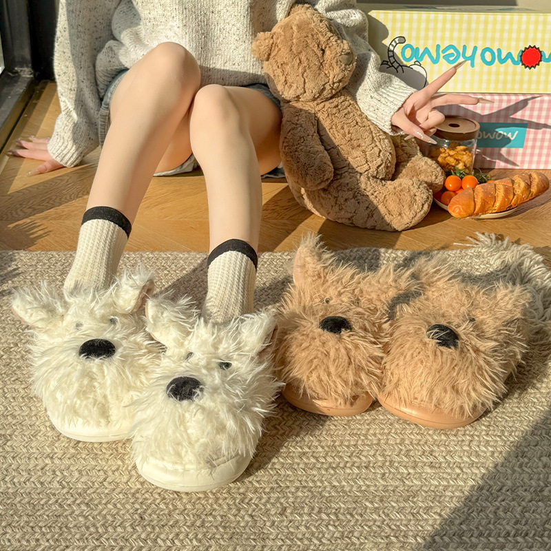毛毛加绒保暖潦草小狗室内居家厚底情侣拖鞋 可爱棉拖鞋 男女秋冬季