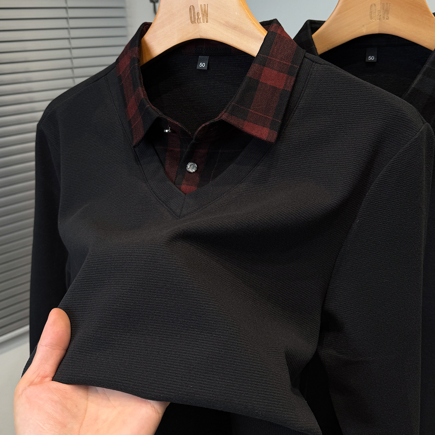 商务休闲中年爸爸装 秋冬季 假两件上衣服 领t恤男长袖 加厚磨毛衬衫