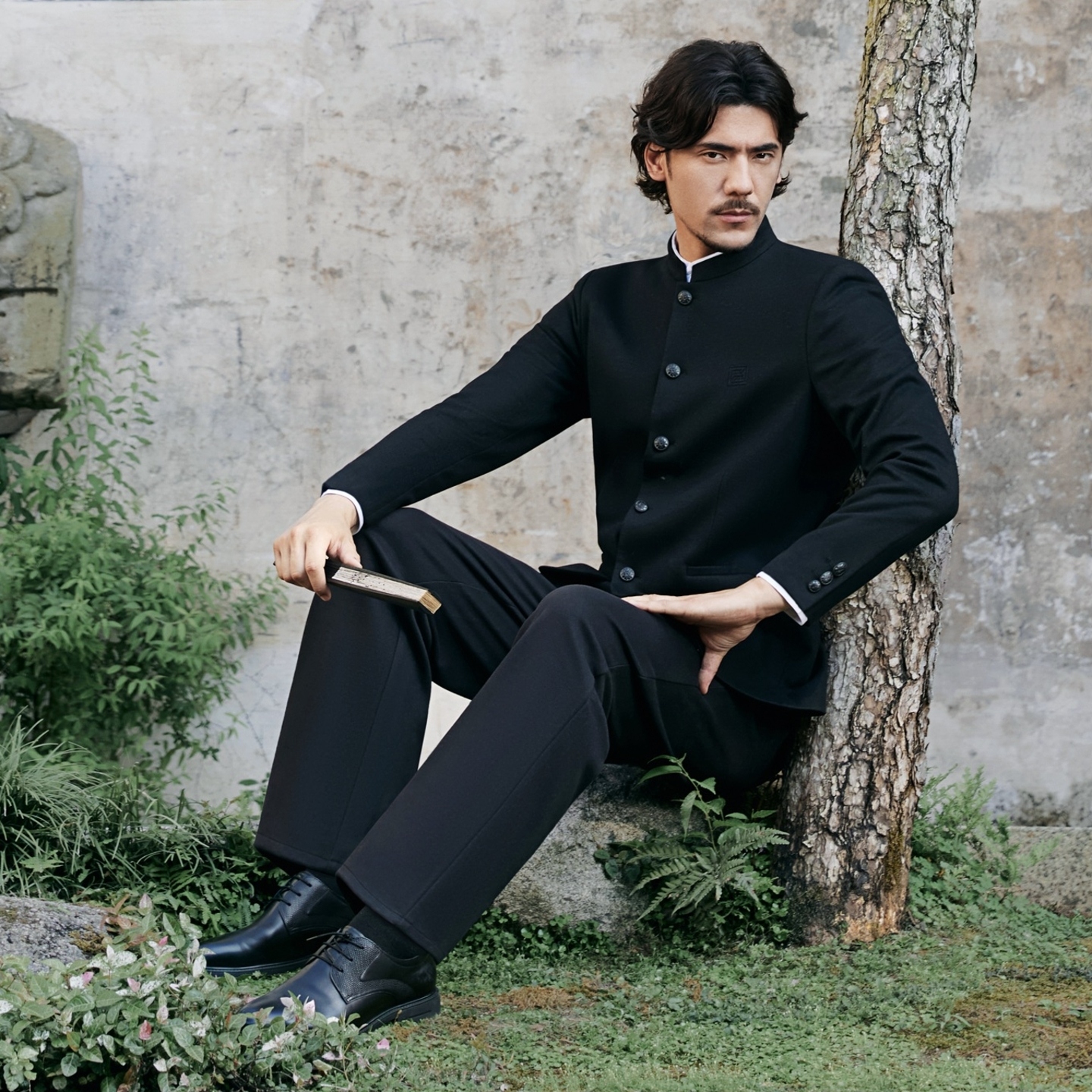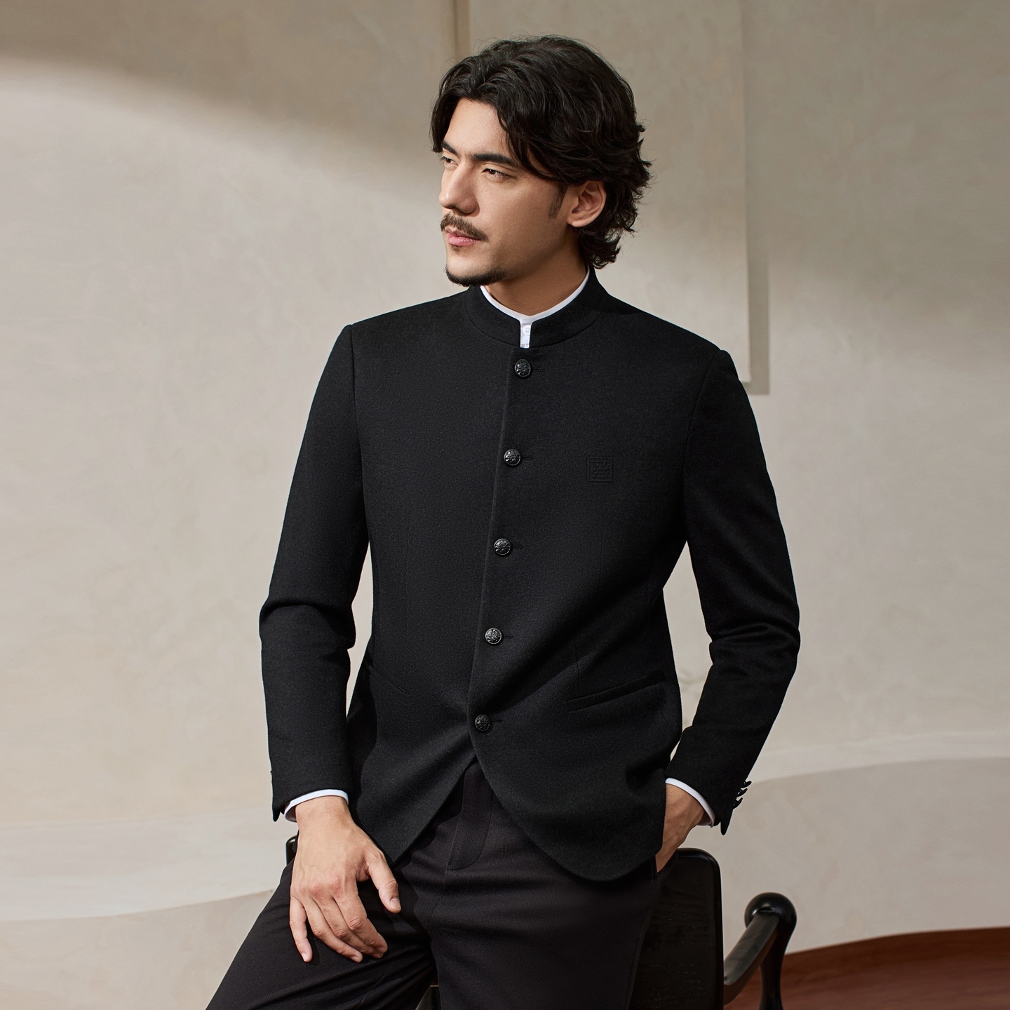 男套装 正装 订婚穿搭礼服高定戗驳领垫肩西服 山茶花刺绣西装 新中式