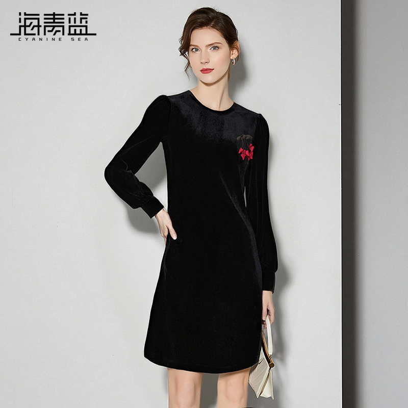 秋冬连衣裙女2025年新款 女装 长袖 气质中长款 丝绒裙子 时尚 海青蓝