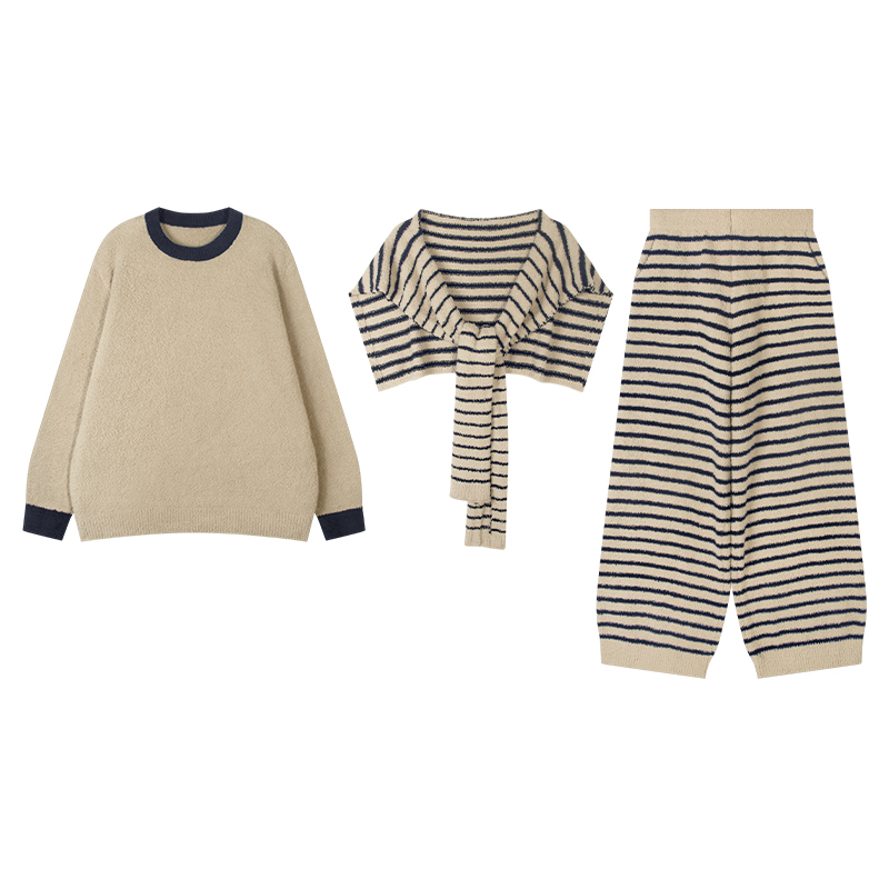三件套保暖家居服 2025新款 微醺小姐睡衣女套装 条纹半边绒加绒冬季