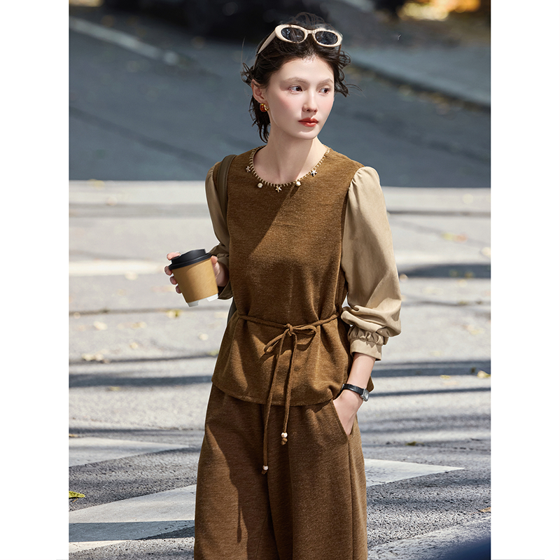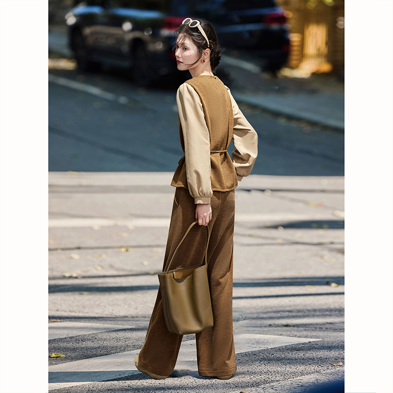 新款 女装 女简约撞色高级气质圆领拼接衬衫 套装 阔腿长裤 2025年秋季