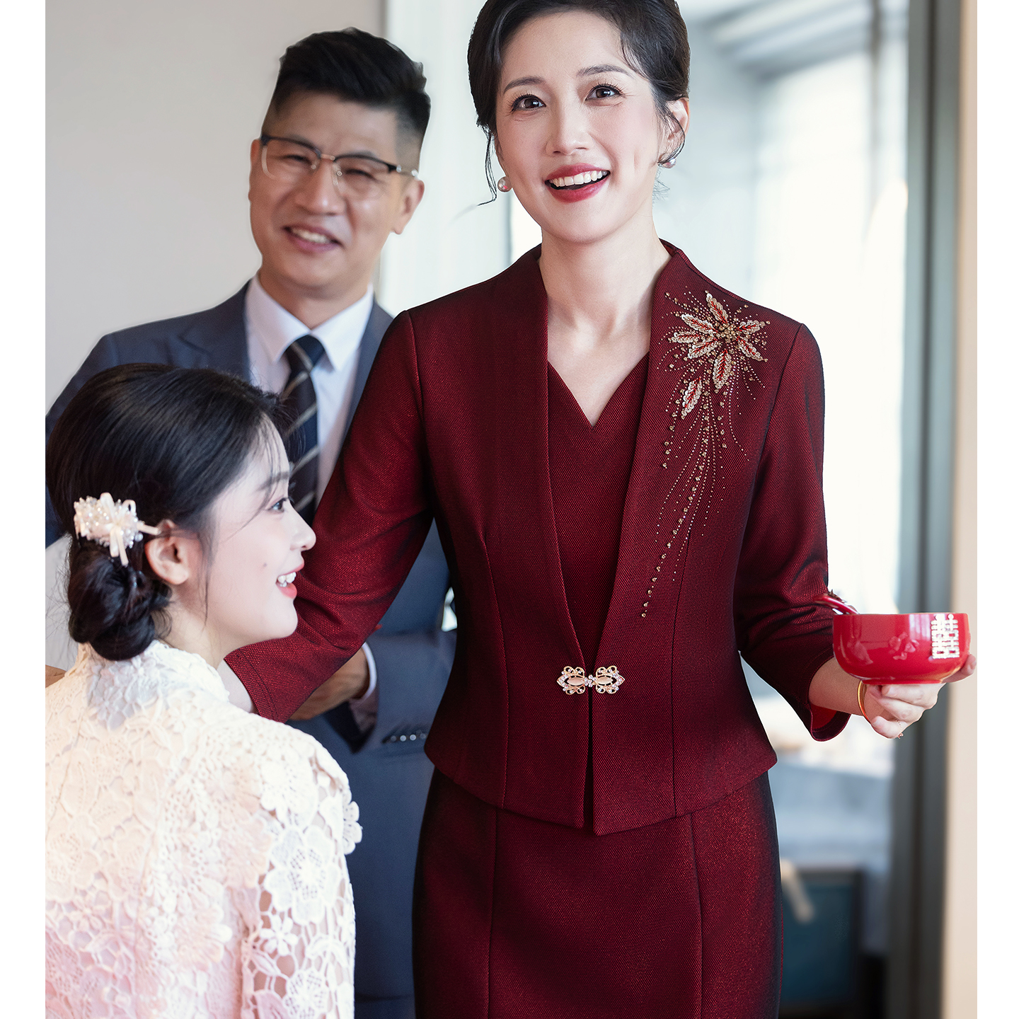 婚礼婆婆旗袍复古长款 旗袍 酒红色醋酸缎提花传统婚礼妈妈婚宴秋季
