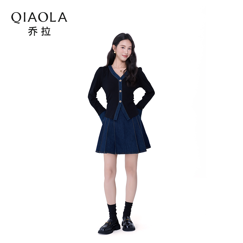 蔚蓝海歌 上衣半裙套装 秋季 黑色牛仔布V领针织开衫 女 新款 乔拉