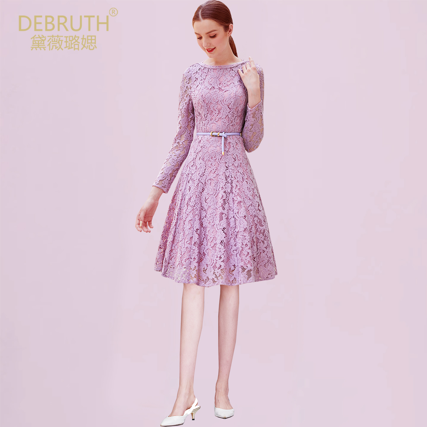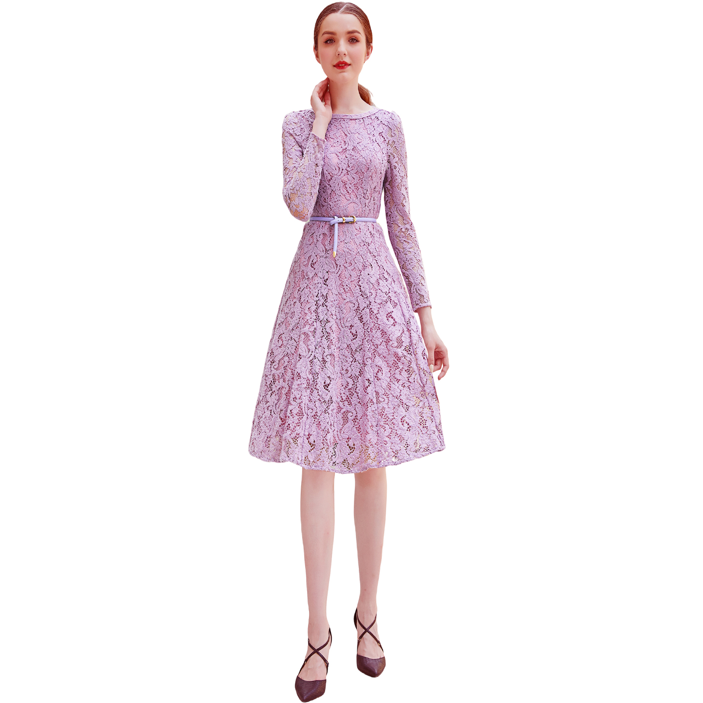 气质收腰A裙紫 法式 黛薇璐媤花边蕾丝长袖 公主连衣裙女2025秋新款