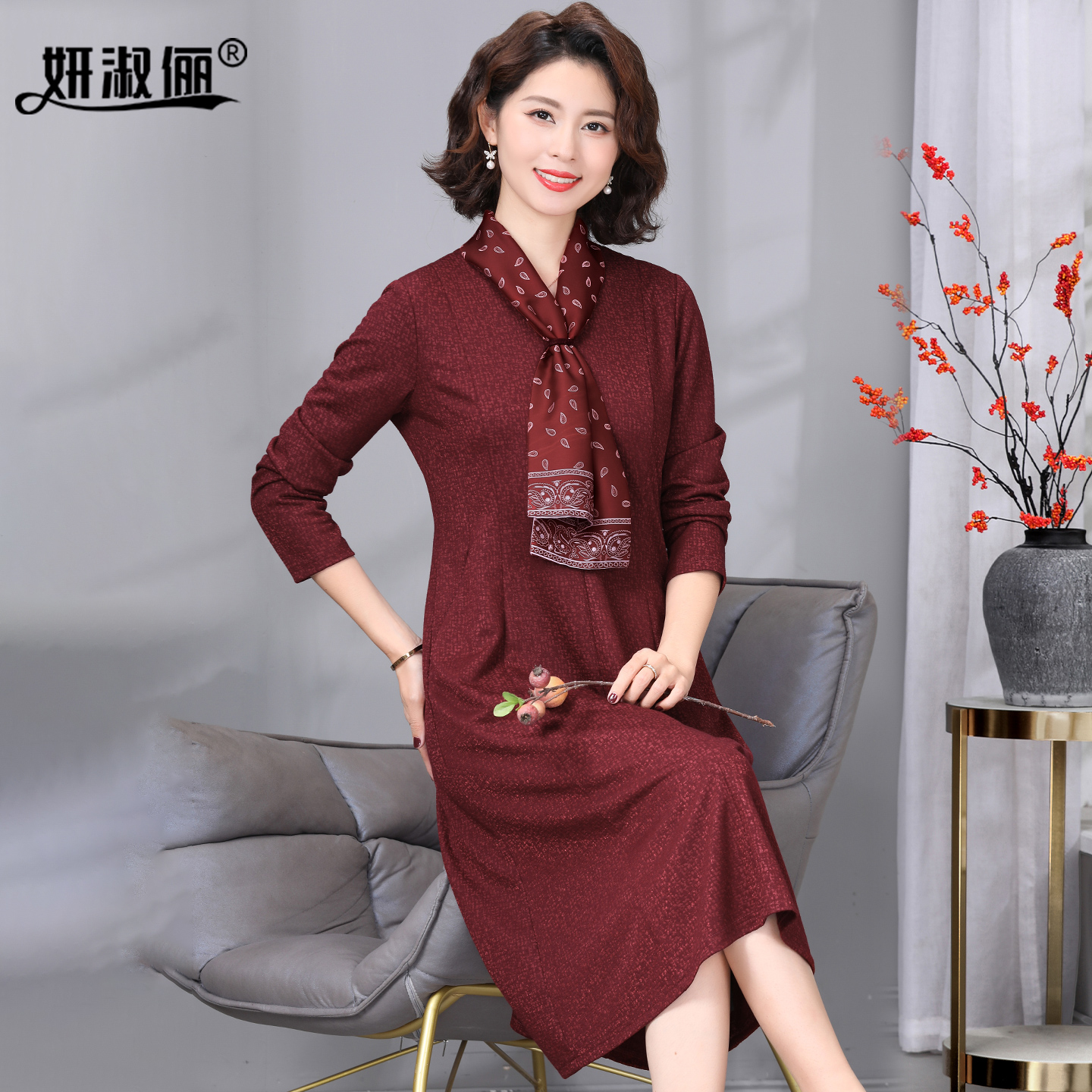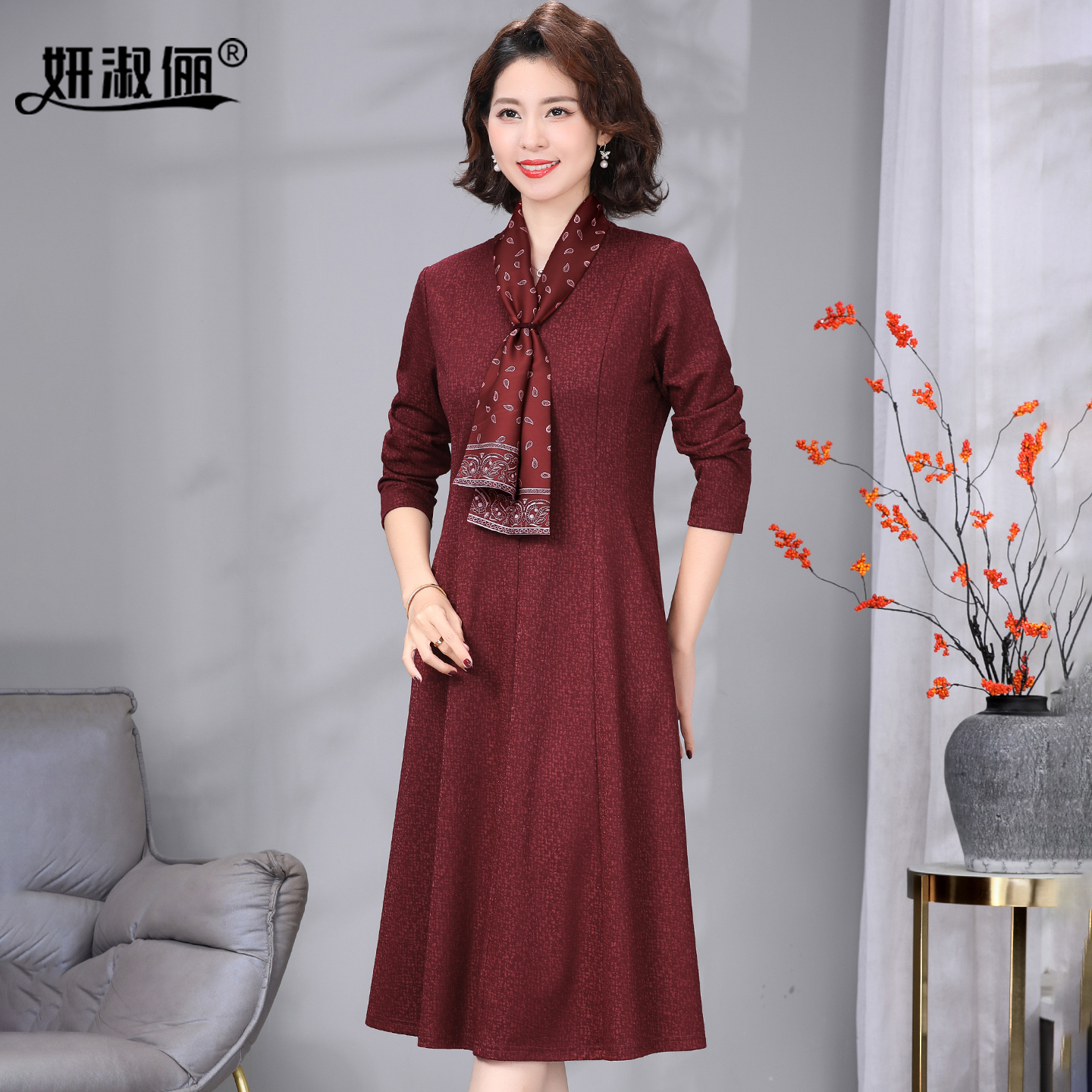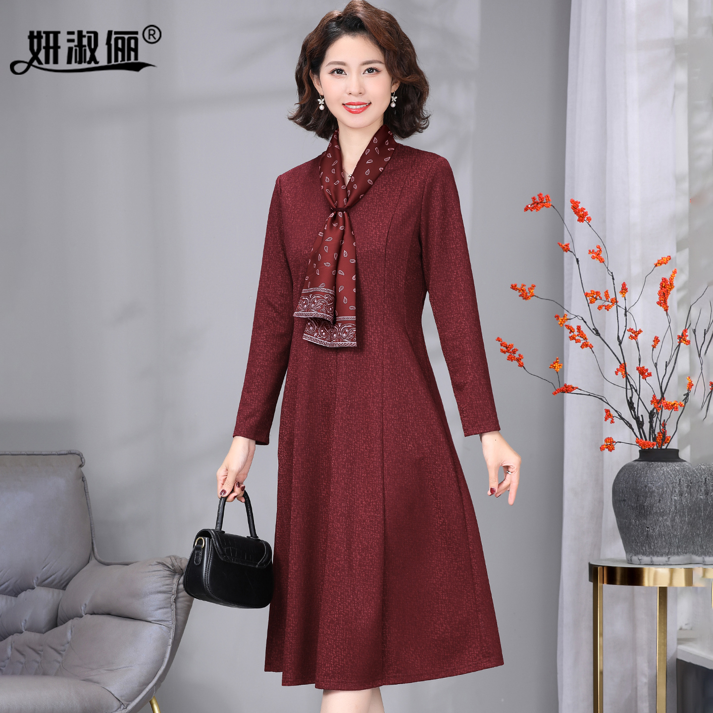 貂绒羊毛连衣裙系丝巾2025新款 10月喜婆婆婚宴装 高端优雅妈妈秋季