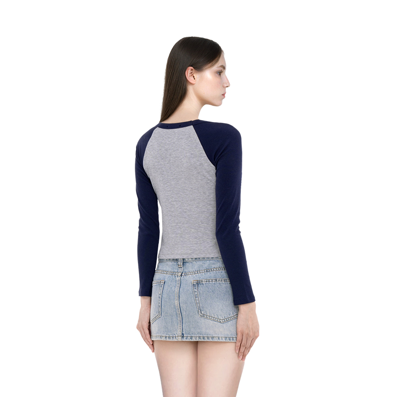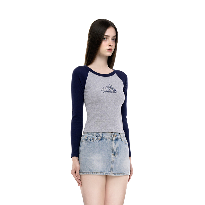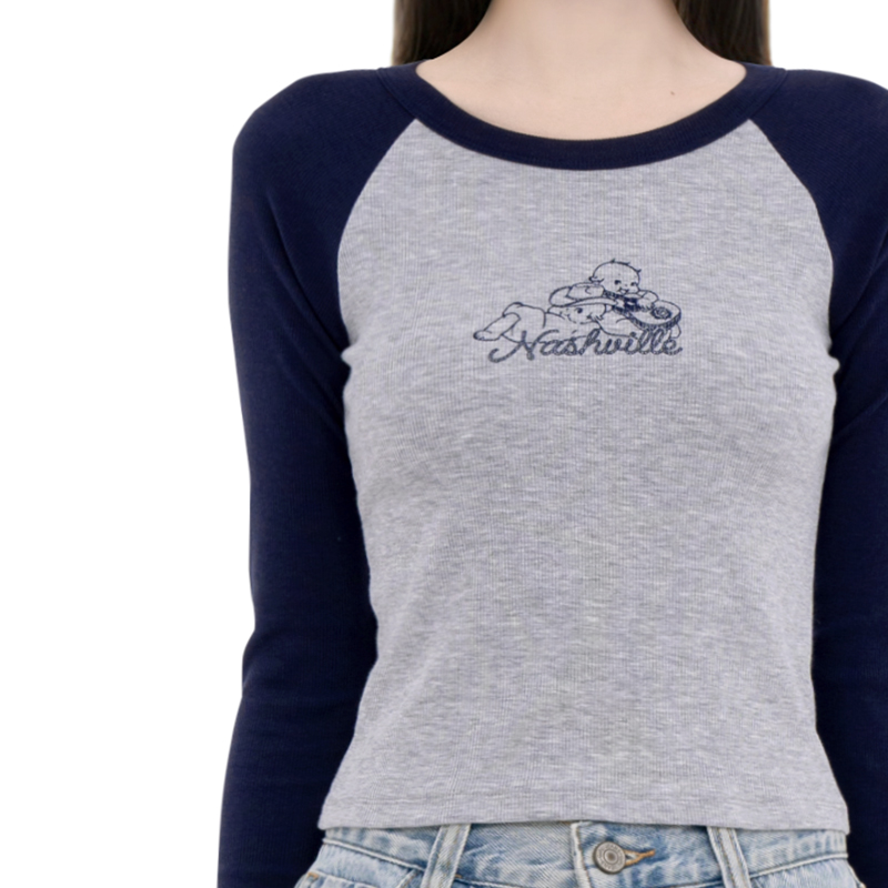 灰拼藏青吉他双天使印花修身 春秋插肩袖 显瘦上衣 女2025新款 BF长袖