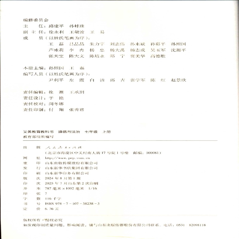 2025六三制道德与法治7七年级上册义务教育教科书人民教育出版 社