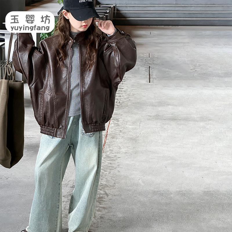 玉婴坊新款 皮夹克潮 女童皮衣外套春秋女孩大童早秋又酷又飒