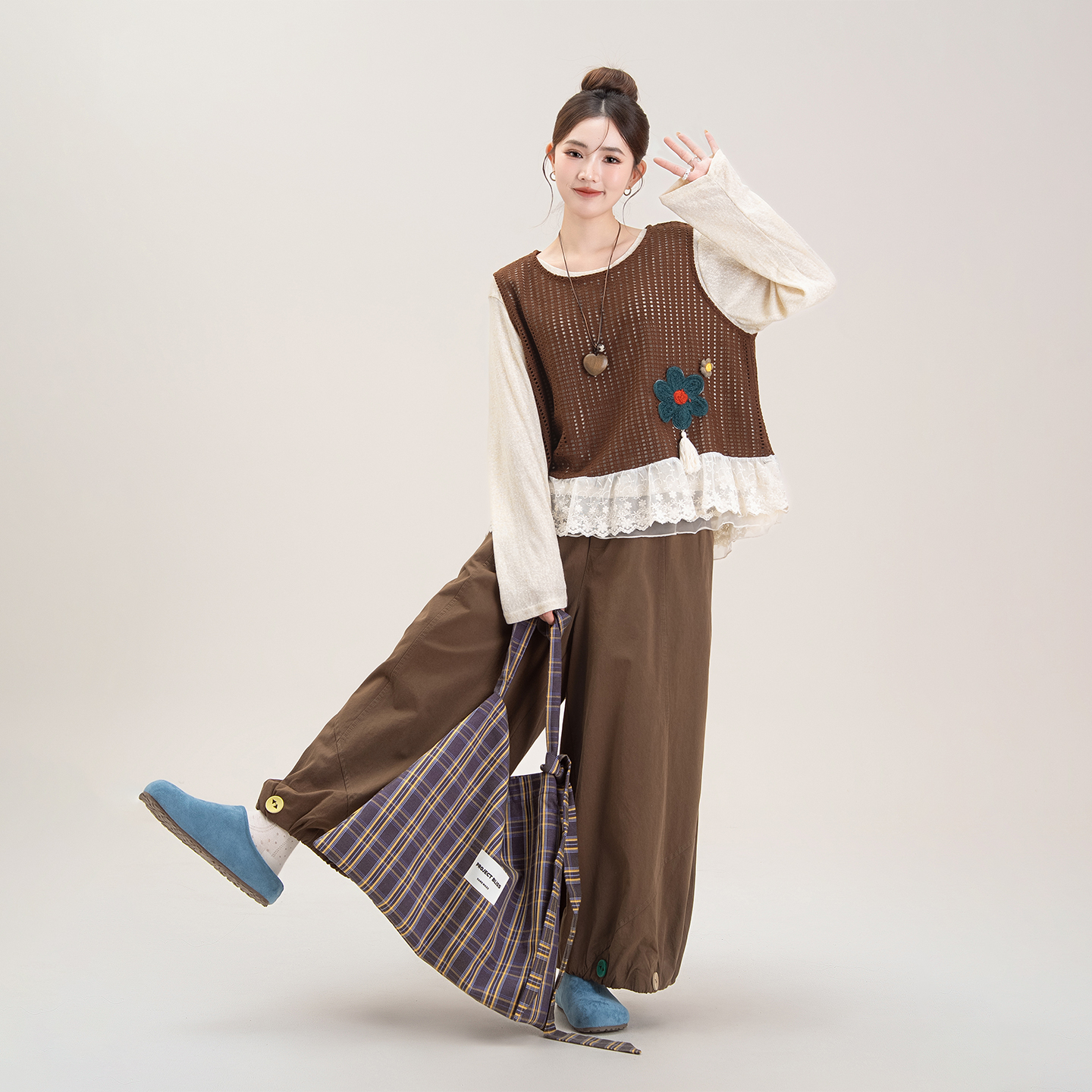 套装 杏色蕾丝拼接长袖 叠穿镂空针织马甲灯笼阔腿裤 新款 T恤女秋季