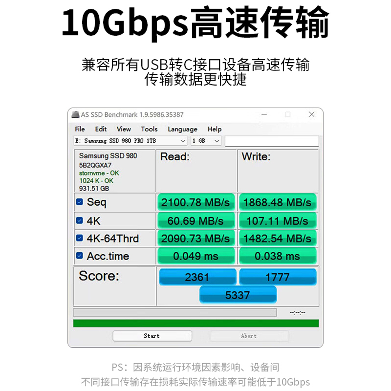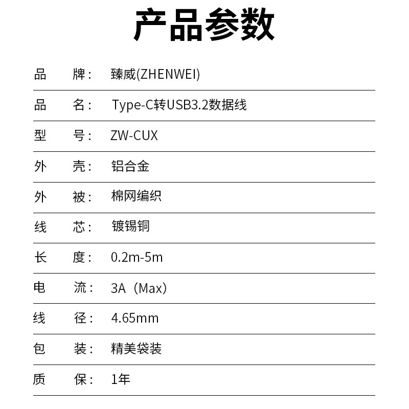 臻威 USB转typec数据线3.2Gen2高速M.2固态SSD适用于移动硬盘盒10Gbps电脑高速传输充电器连接手机快充线