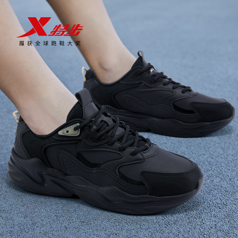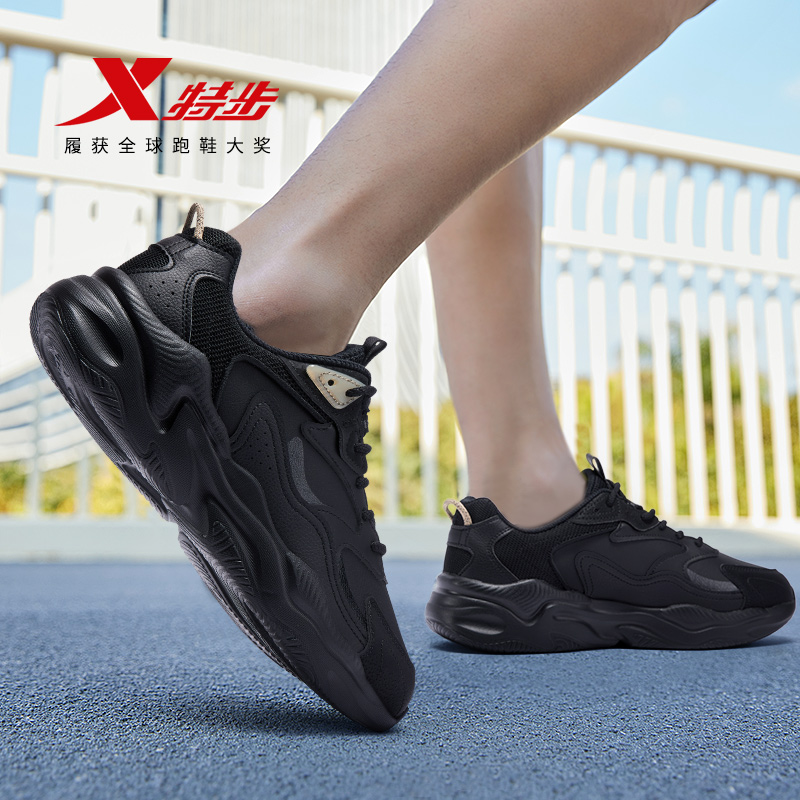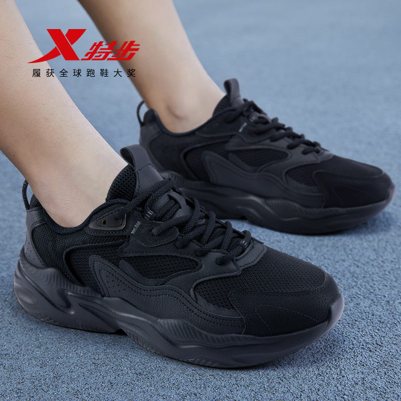 青少年纯黑色老爹鞋 特步男鞋 2025新款 运动鞋 黑武士减震软底跑步鞋