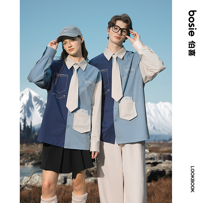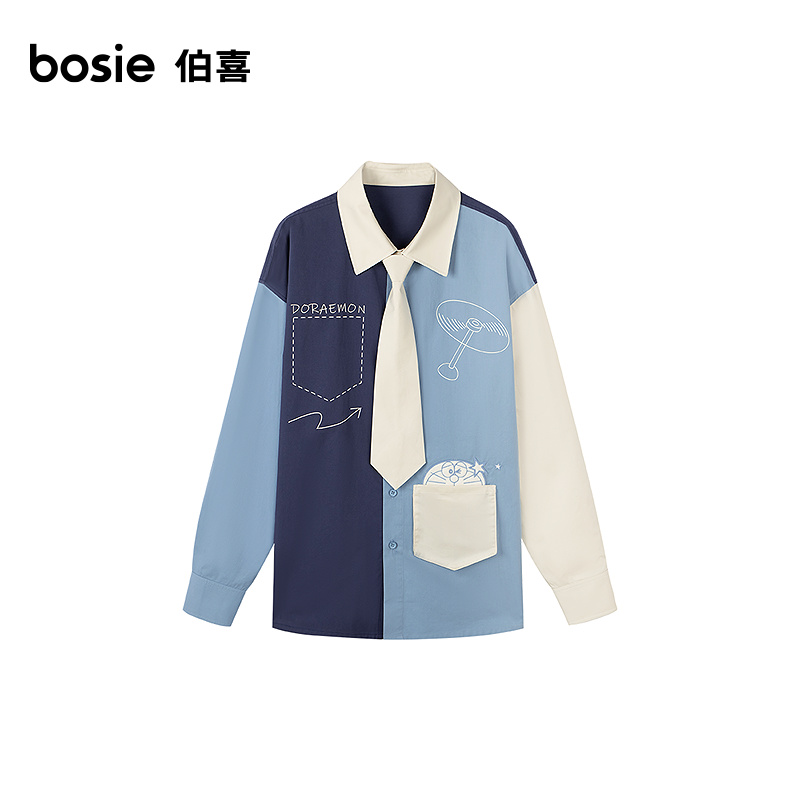 哆啦A梦 衬衫 bosie伯喜2025年秋季 领带拼接学院长袖 男情侣 新款
