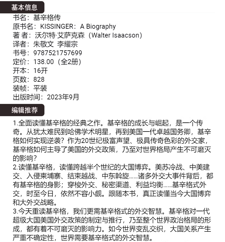 全本传记 读基辛格不容错过 沃尔特艾萨克森著 著 正版 世界秩序论中国人工智能时代与人类未来中信出版 基辛格传全2册