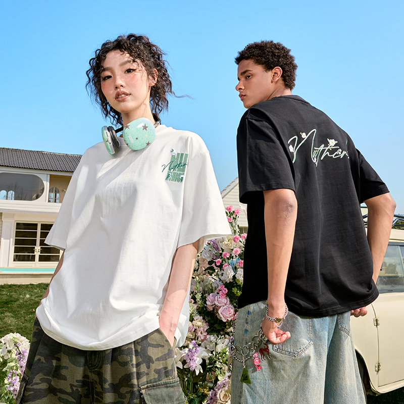 潮牌宽松男女2025夏新款 Nuthink重磅刺绣短袖 T恤花卉情侣字母美式