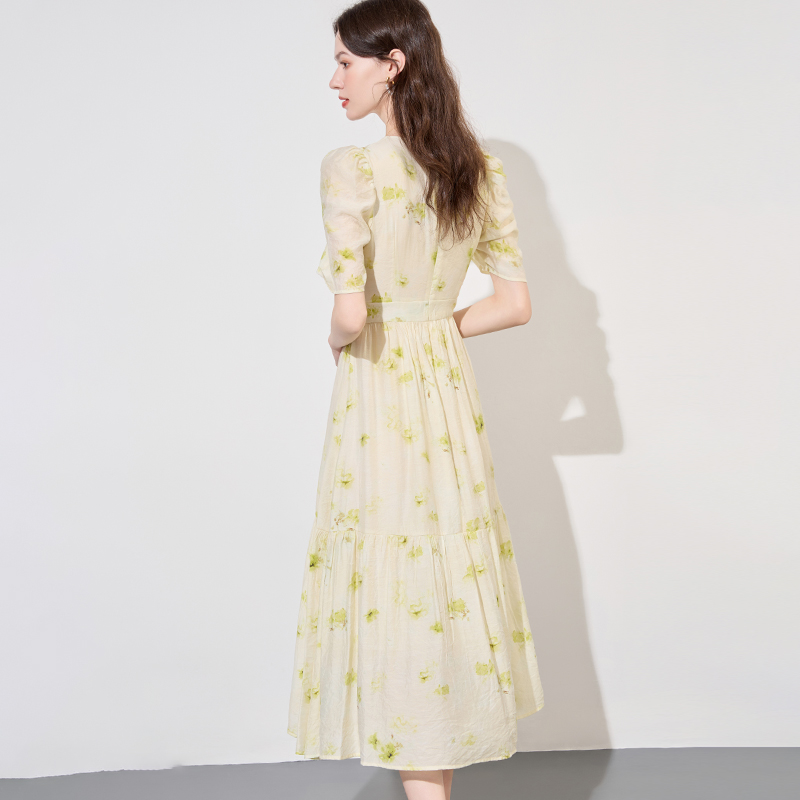 中长款 2025夏季 气质天丝连衣裙V领高腰短袖 茶歇法式 A字裙子女 新款