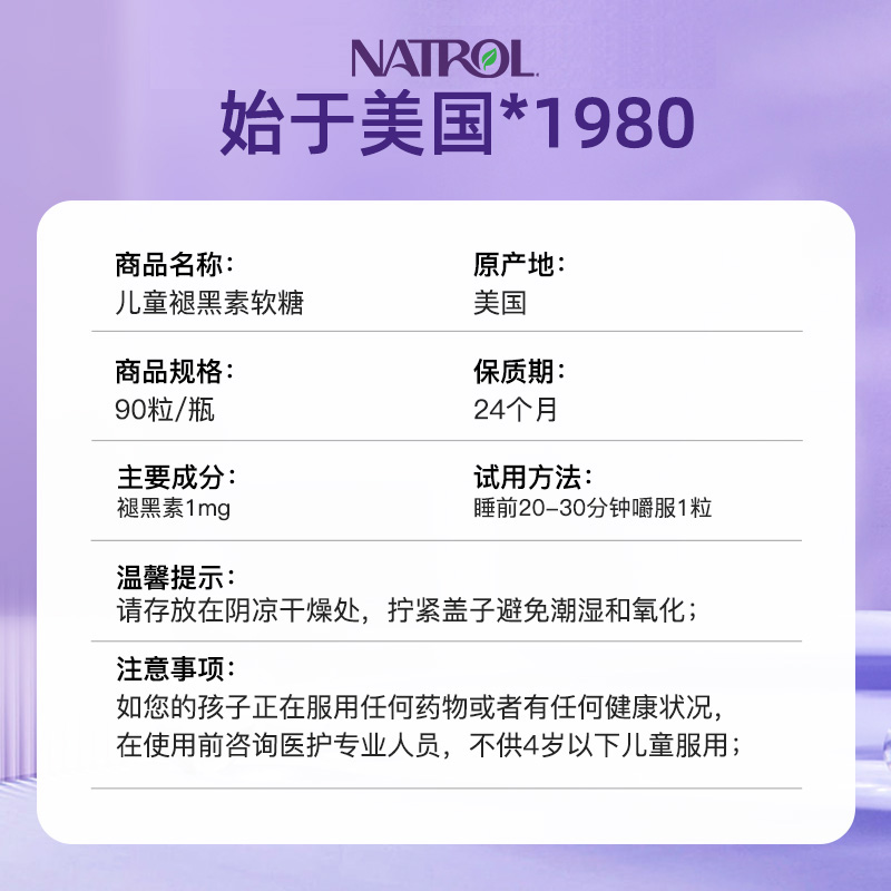 美国Natrol儿童褪黑素睡眠软糖1mg学生安瓶助眠退黑素青少年90粒