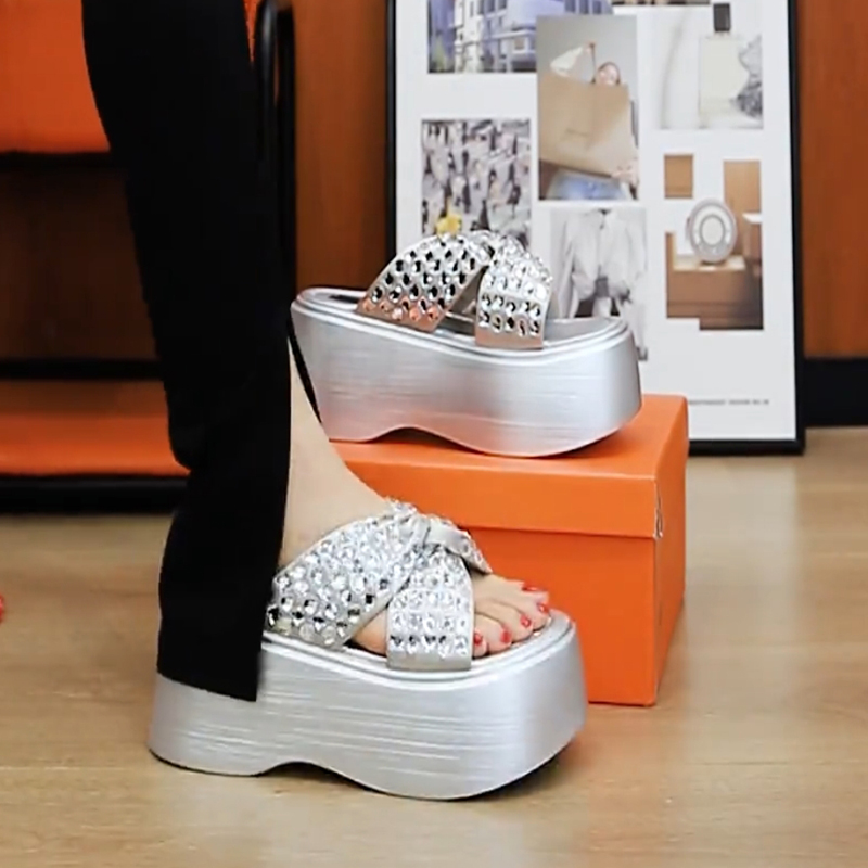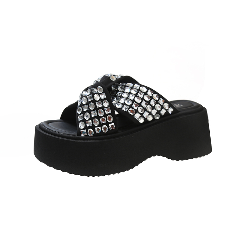 8cm小个子厚底拖鞋 交叉一字拖网红水钻增高凉拖 女夏外穿2024新款