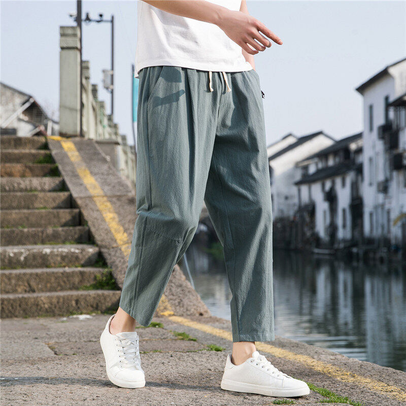 男裤 夏直筒宽松灯笼裤 子夏季 日系休闲八分裤 棉麻哈伦裤 亚麻九分裤