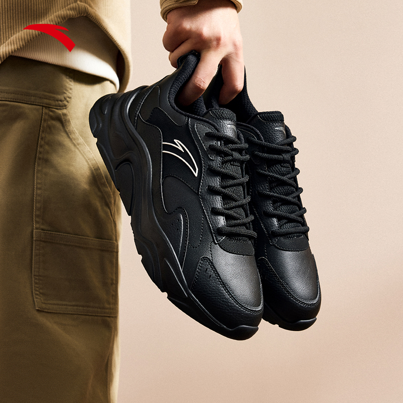 皮面防泼水爸爸减震网面休闲鞋 特步跑步鞋 黑色运动鞋 秋冬新款 男鞋