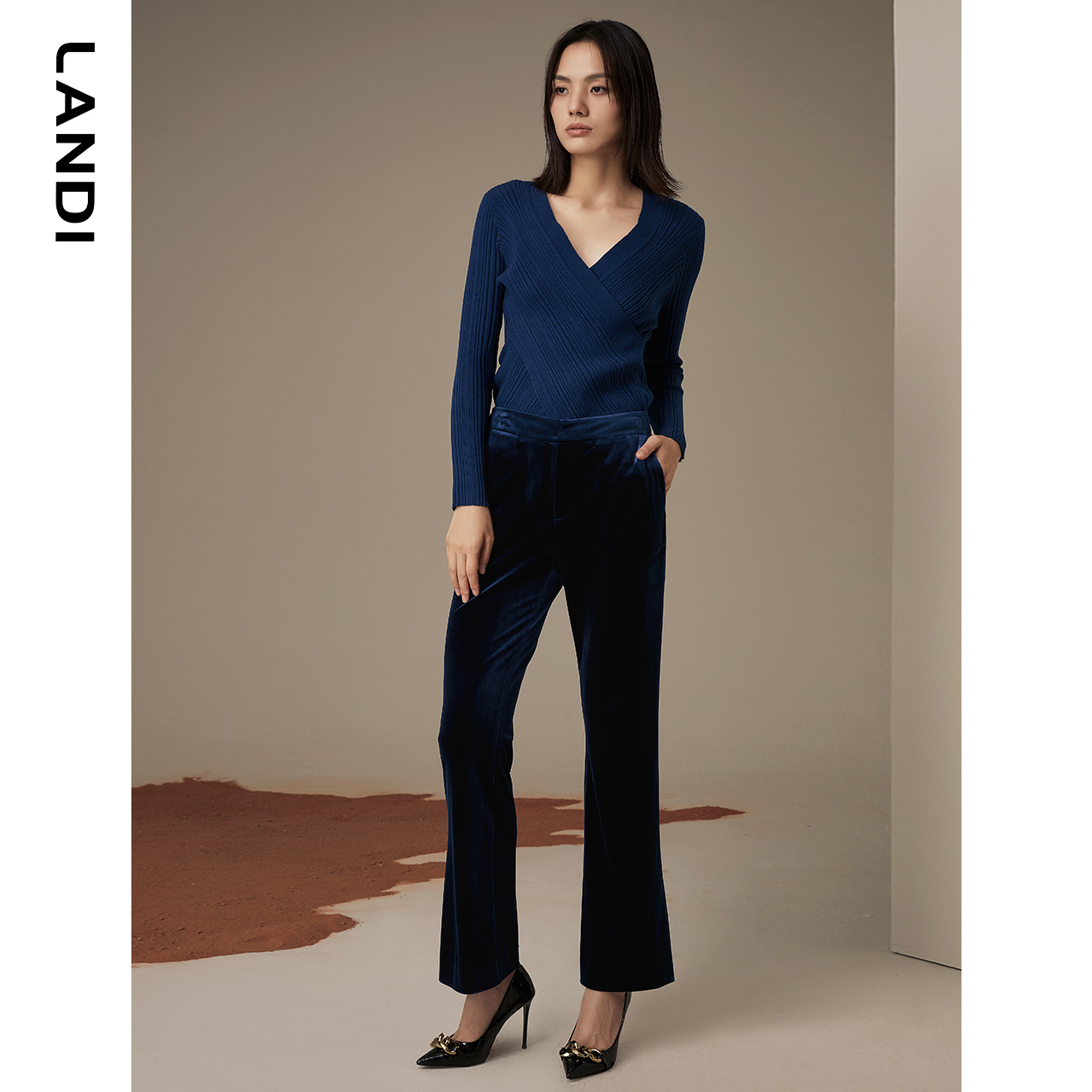 冬新品 LANDI蓝地藏蓝色复古气质丝绒修身 女长裤 裤 显瘦微喇西装