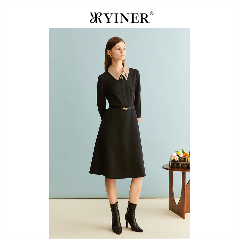 帝柔帝柔黑色连衣裙2025秋季 显瘦通勤 套头高腰休闲腰带简约大码