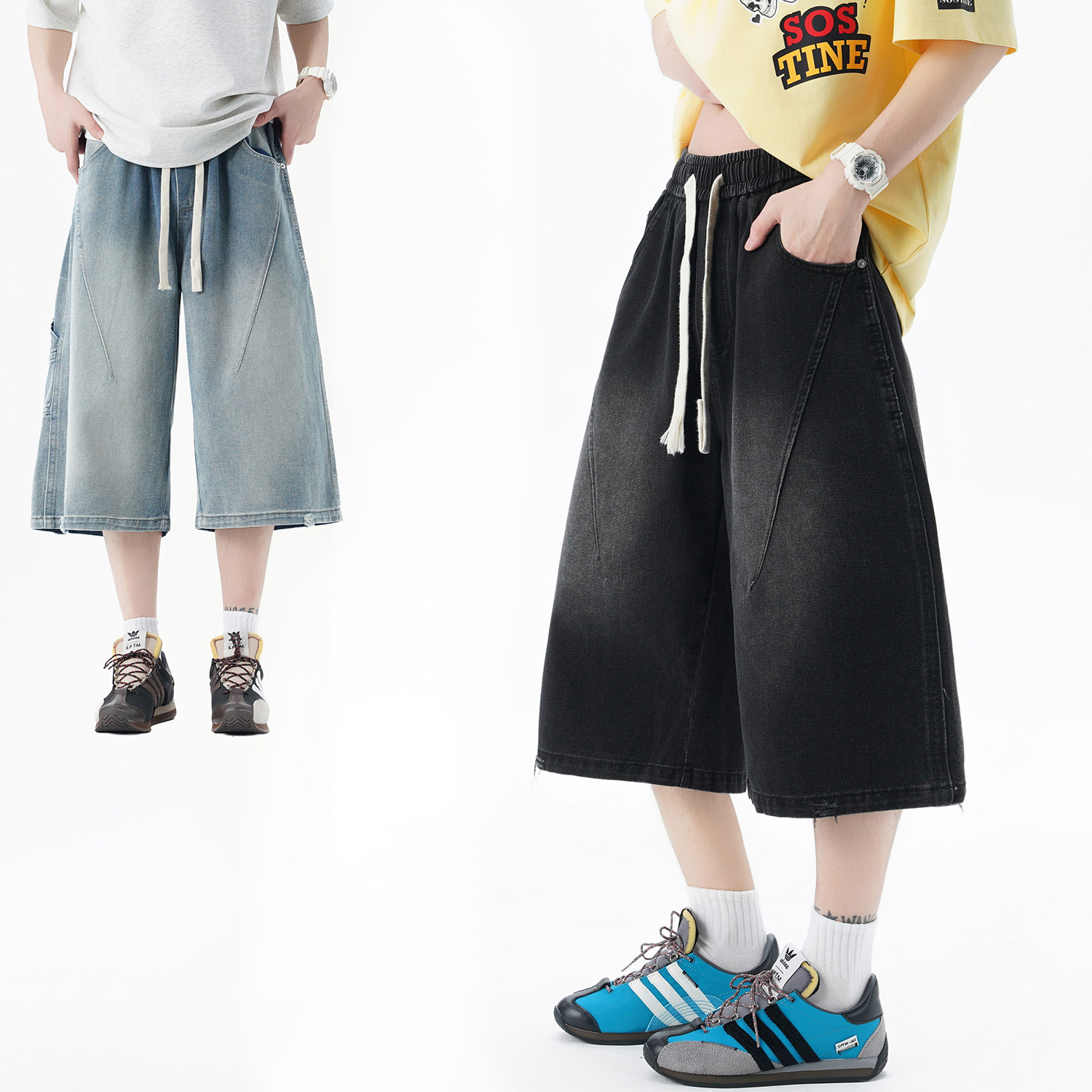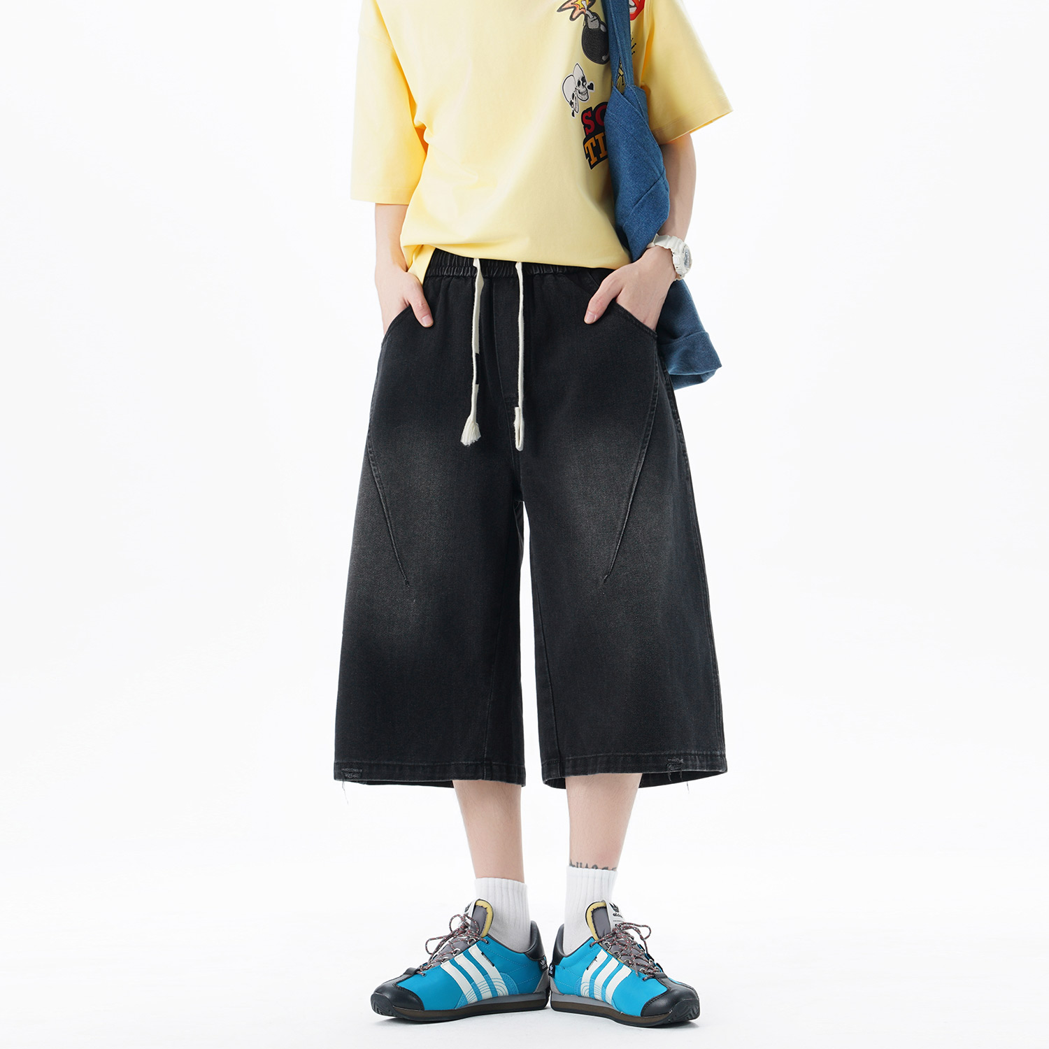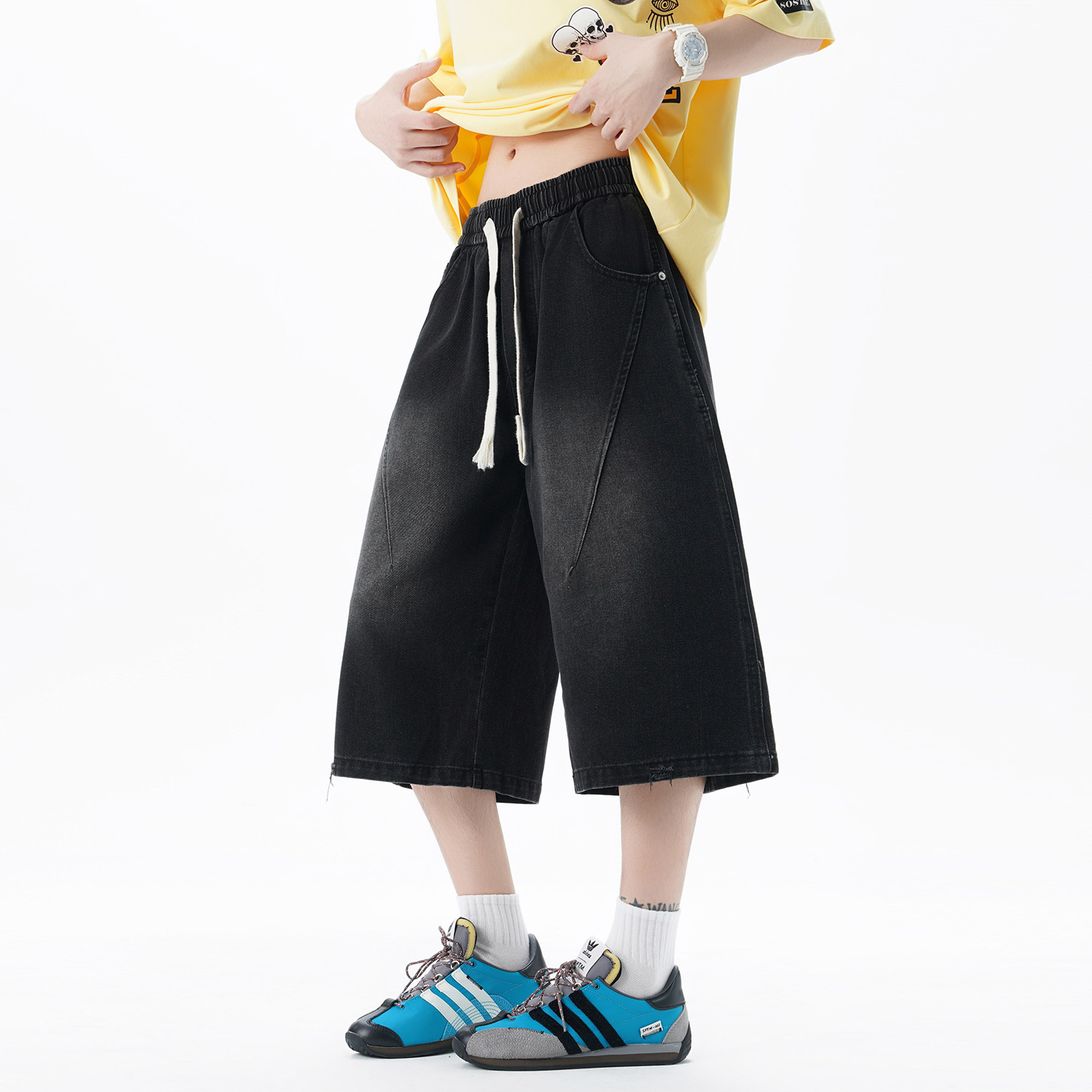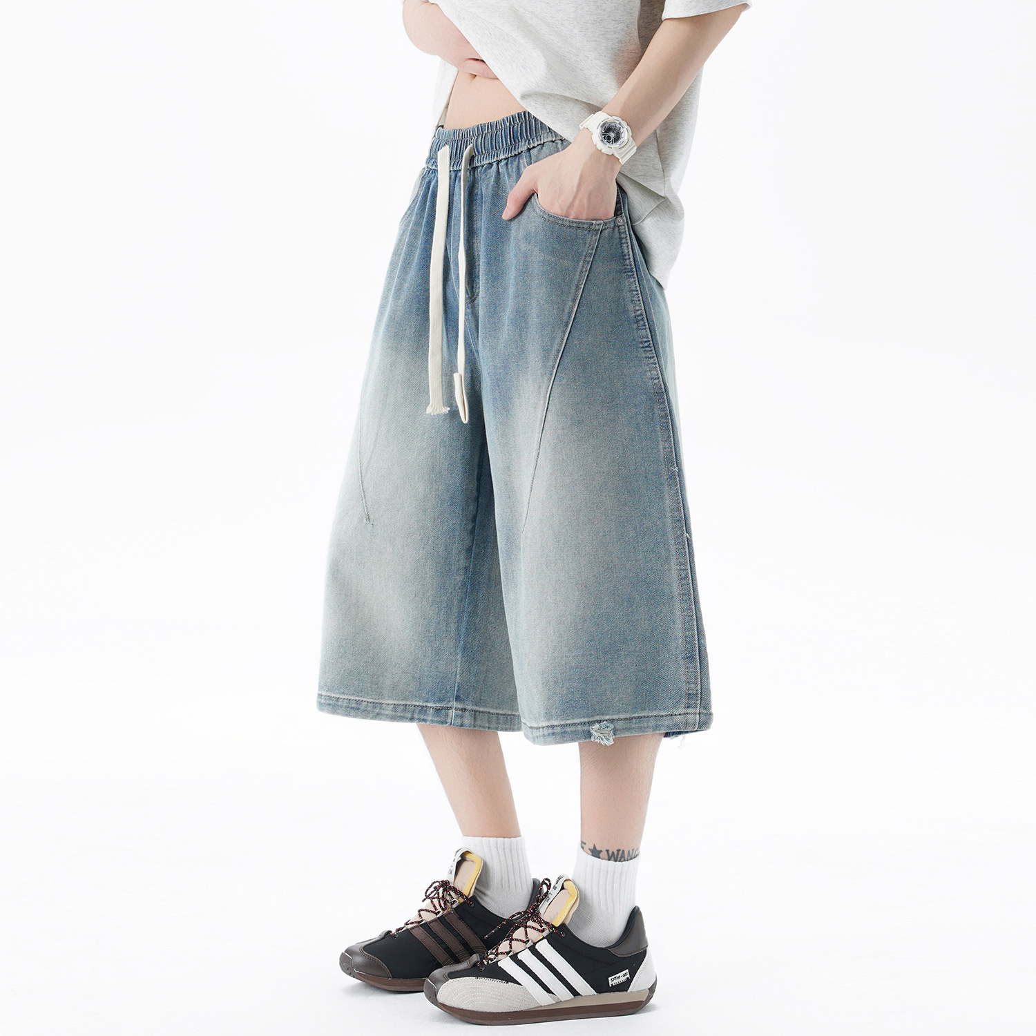 潮牌休闲松紧男女2025夏新款 七分裤 复古直筒牛仔短裤 Nuthink美式