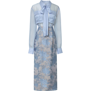 蓝色提花直筒半裙套装 2025春季 都市直身宽松薄纱半透衬衫 法式 新款