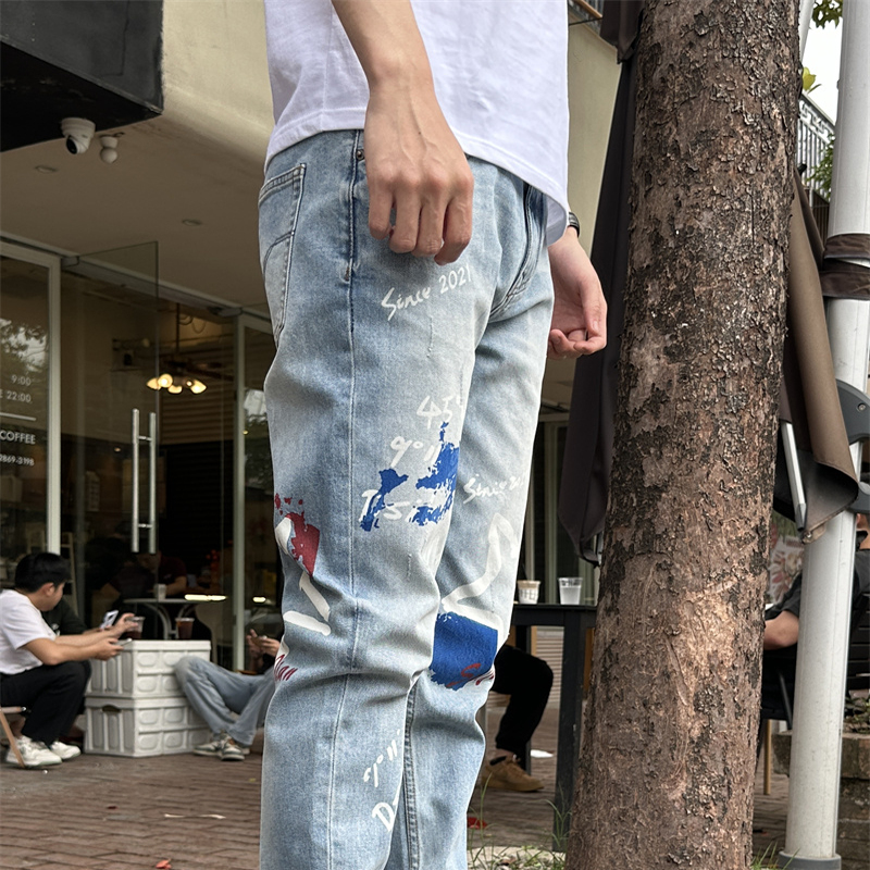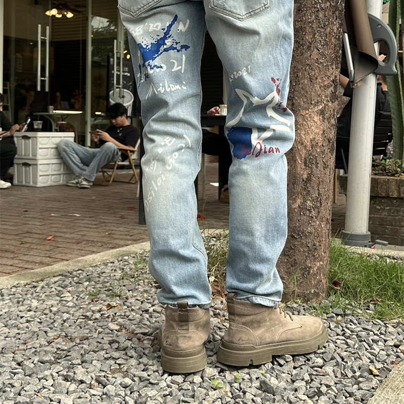 小直筒长裤 个性 高街百搭修身 男高端印花潮流美式 设计感水洗牛仔裤
