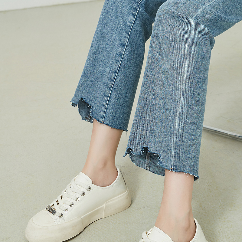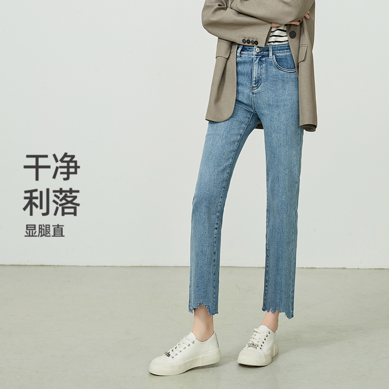 小个子弹力高腰九分直筒裤 新款 子 女2025秋季 逸阳不规则毛边牛仔裤