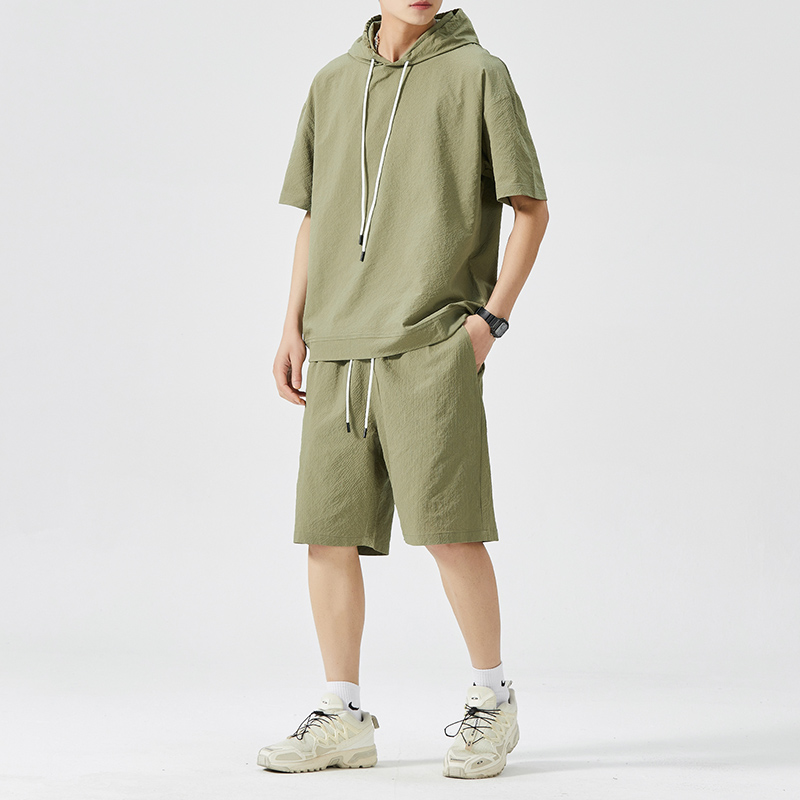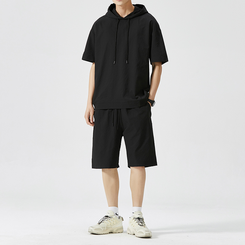 连帽短袖 男士 t恤短裤 套装 休闲梭织泡泡格 夏季 运动两件套男装 新款
