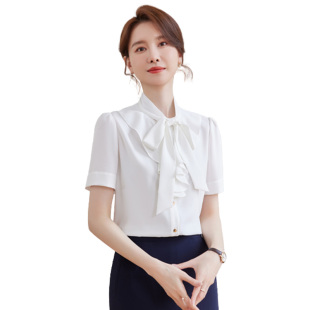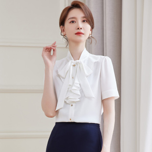 白色衬衣工作服气质优雅飘带雪纺上衣 短袖 诗璐雅职业衬衫 女士夏季