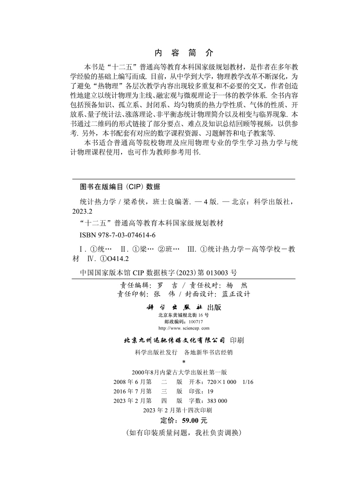 梁希侠 班士良 科学 现货正版 社 十二五规划教材 龙门书局出版 9787030746146 统计热力学第四版