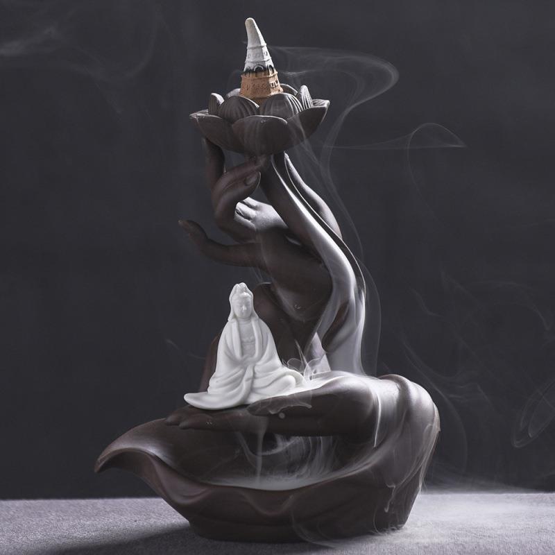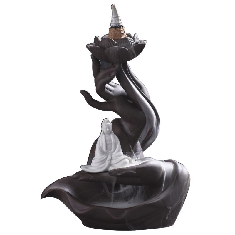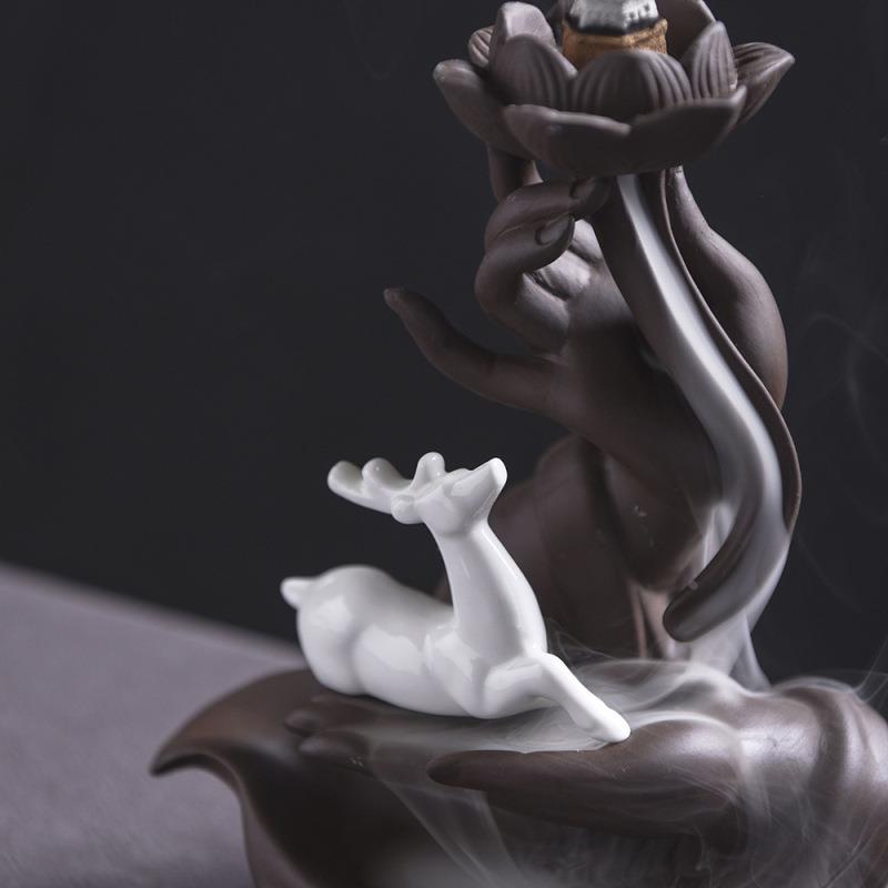 跨境紫砂莲花佛手倒流香炉创意白色小鹿佛手塔香炉家居工艺品摆件