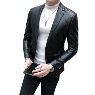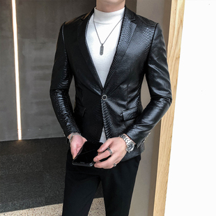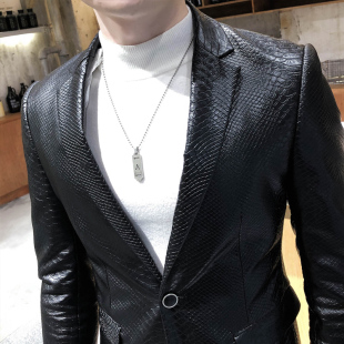夹克潮流男 西服裂皮纹路黑色西装 秋冬加薄绒主播酷皮衣男修身 个性