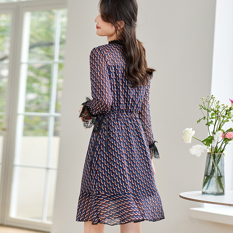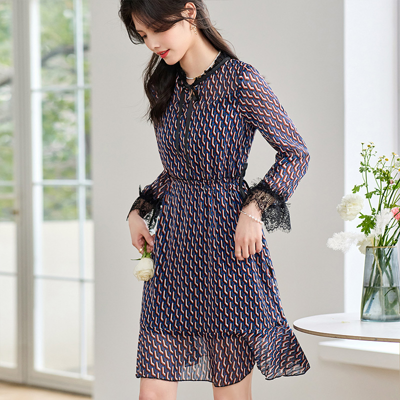 雪纺印花花边领淑女连衣裙B3516 时尚 百依秀子2025春秋新款 女装