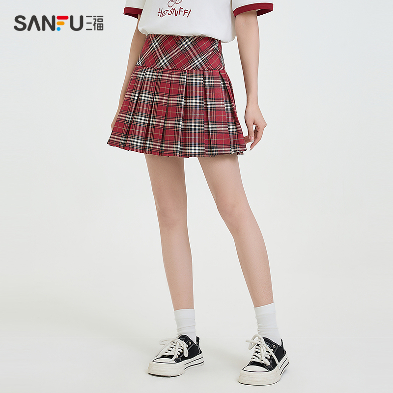 498353 有内衬学院风宽腰格子半身裙女装 三福百褶短裙2025新款 秋季