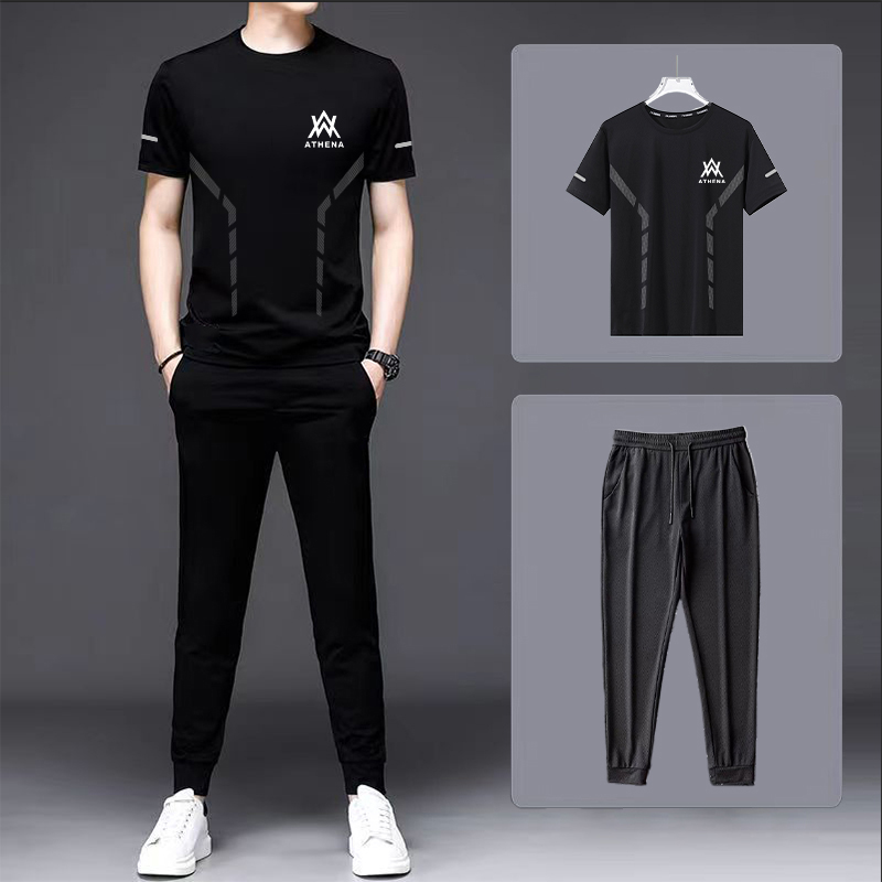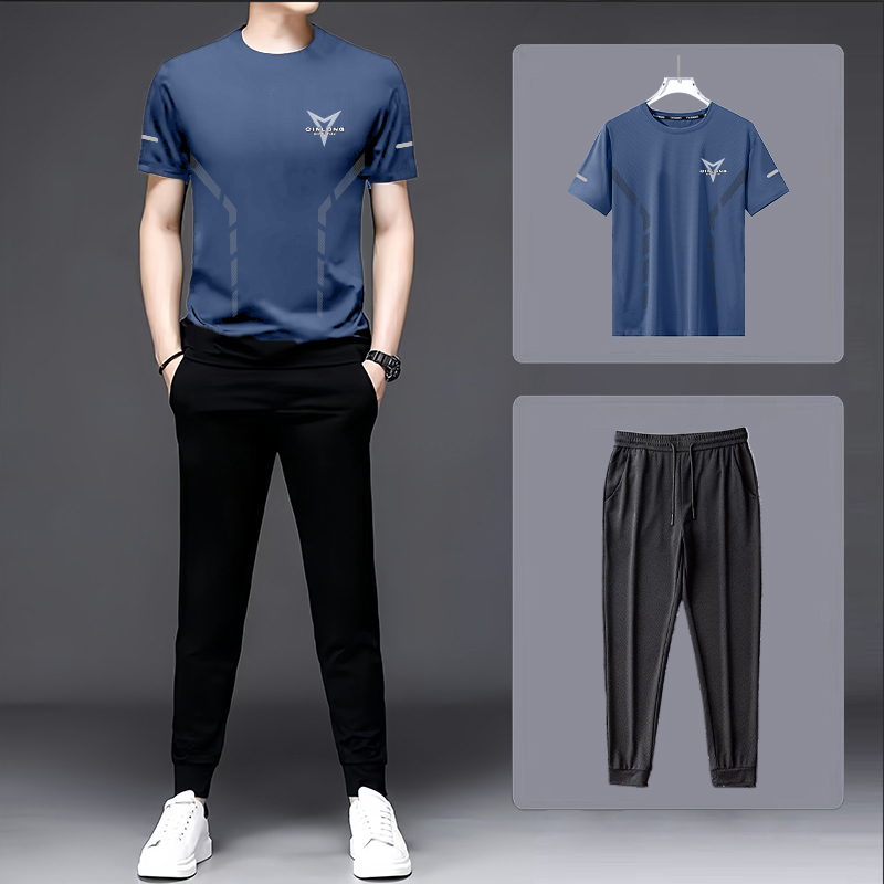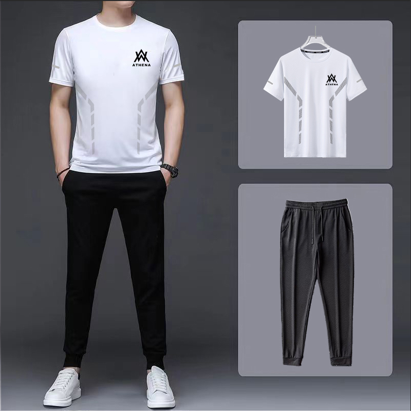 男士 夏季 跑步速干衣服短袖 短裤 回力冰丝休闲运动健身套装 男装 男款