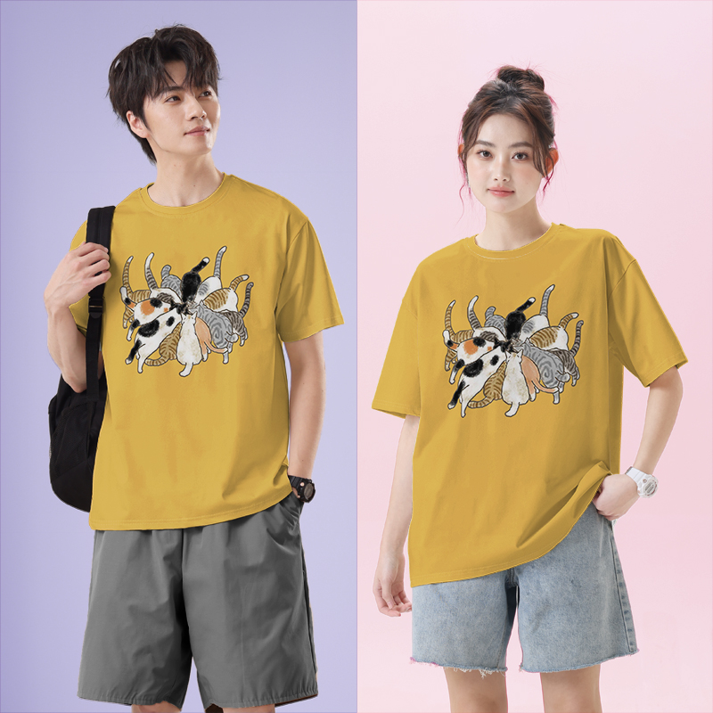 一群猫猫萌宠猫舍吃饭有趣短袖 无界 T恤男女动物图案夏体恤0014设