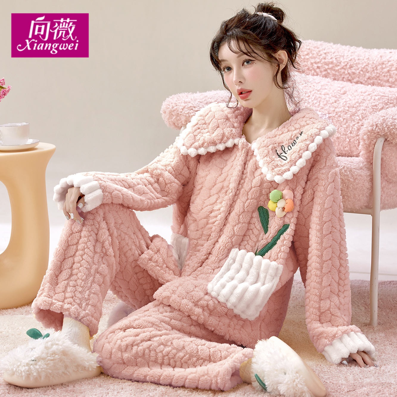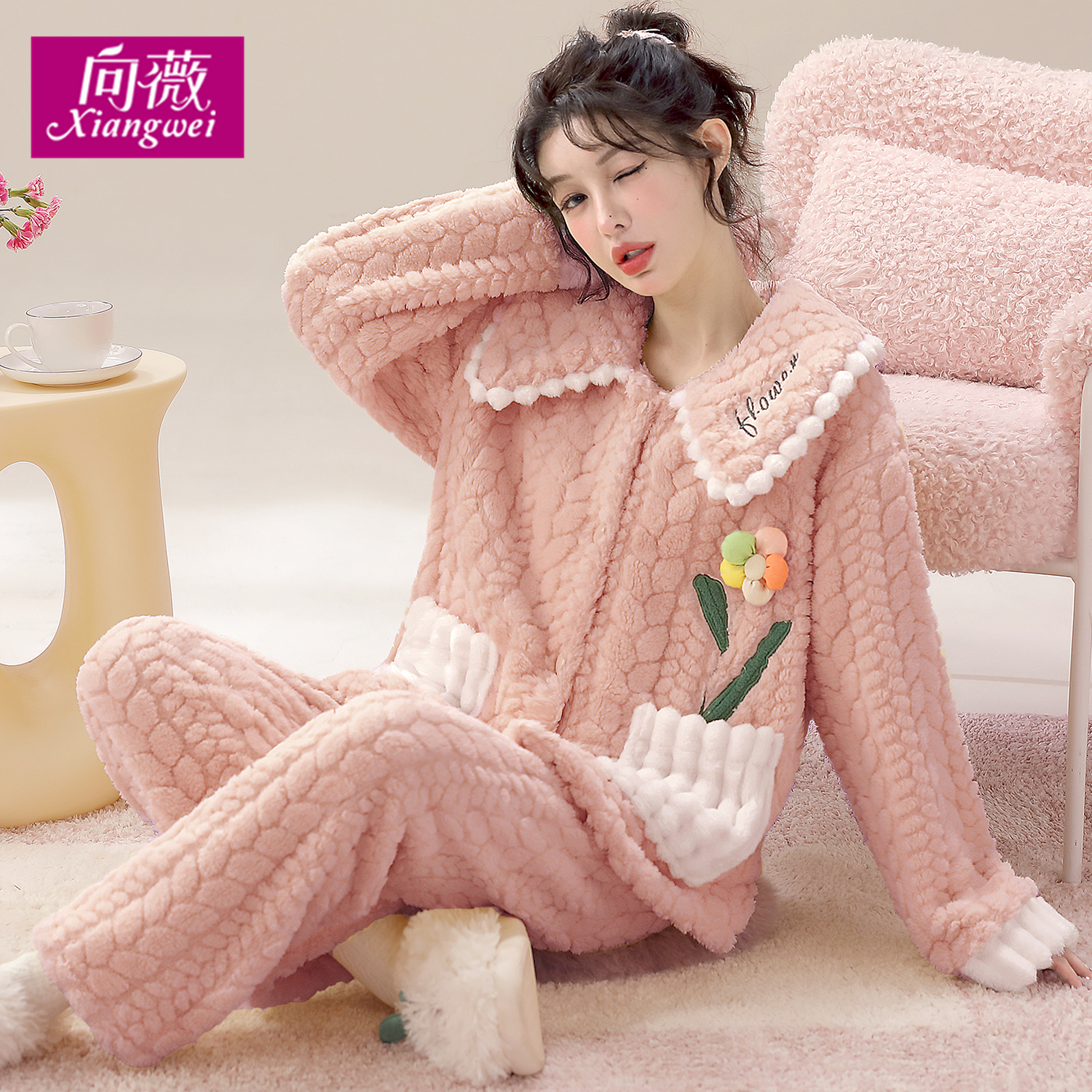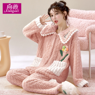 可外穿毛绒珊瑚绒家居服秋冬甜美可爱加绒加厚法兰绒保暖睡衣套装