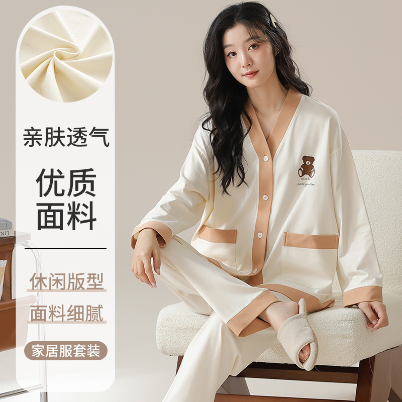 甜美卡通可外穿家居服套装 长裤 棉质和服V领长袖 HNAN睡衣女春秋季