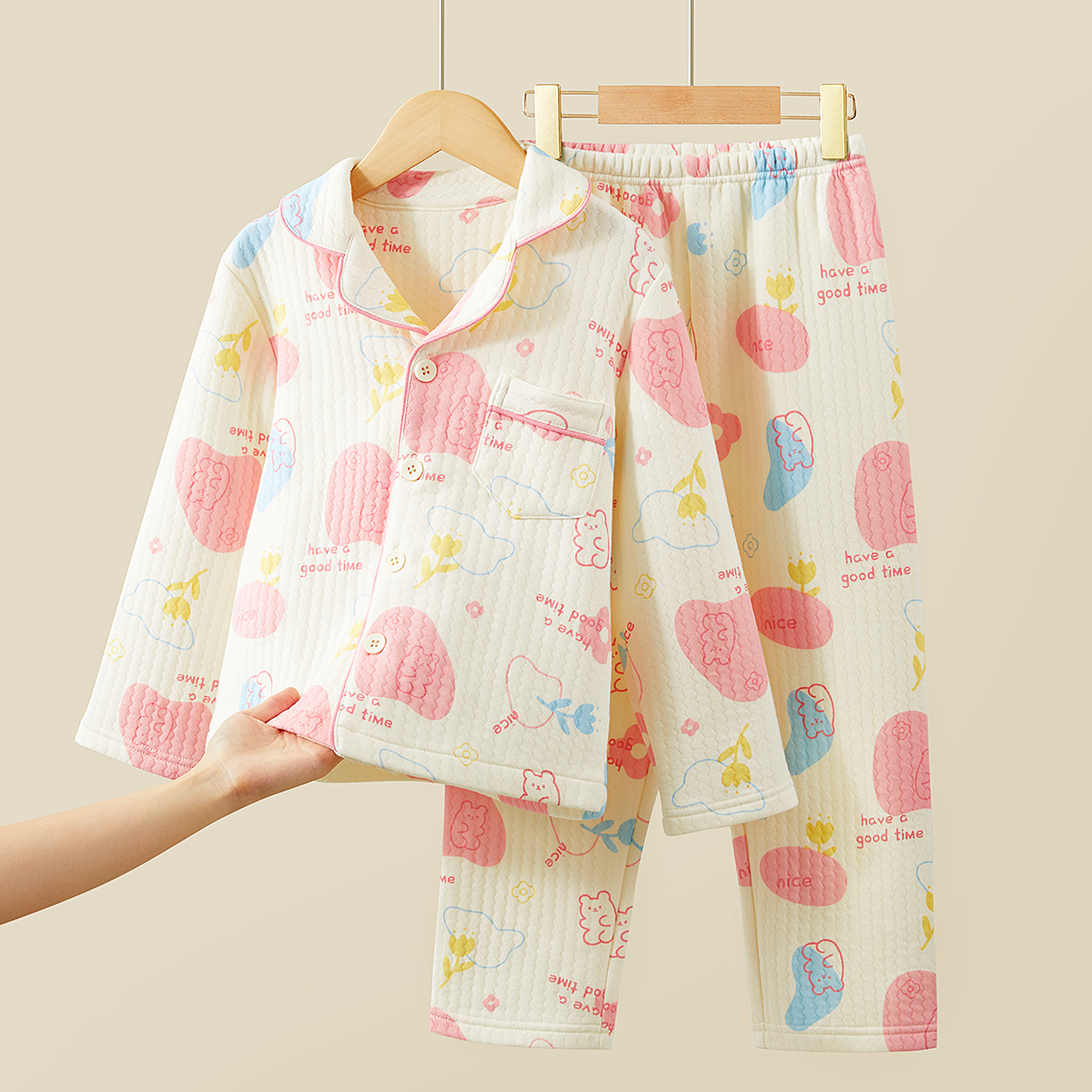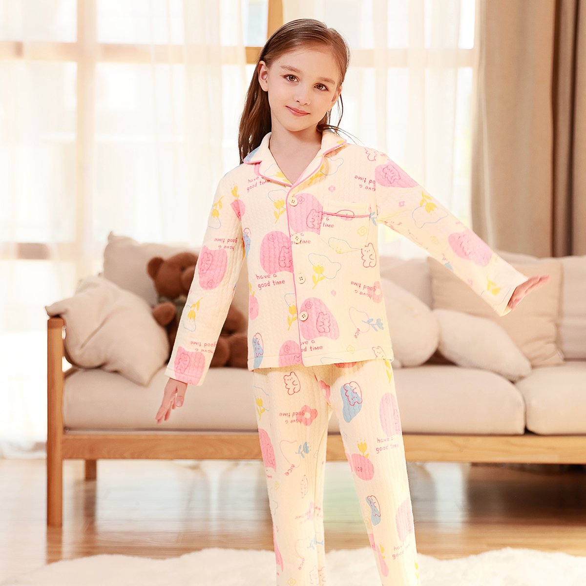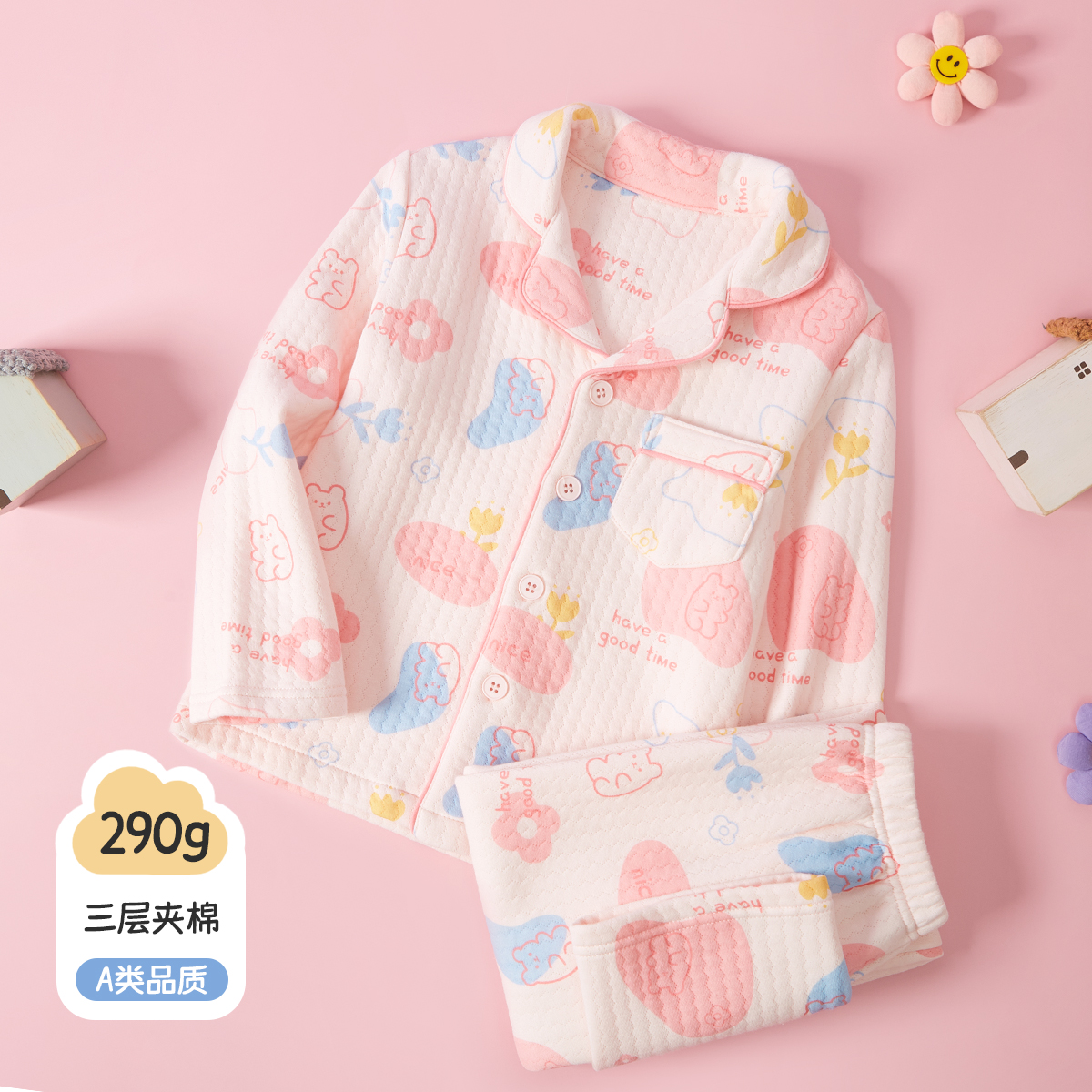 笛莎女宝开衫 中大童290G三层夹棉保暖循环锁温 加厚家居服套装