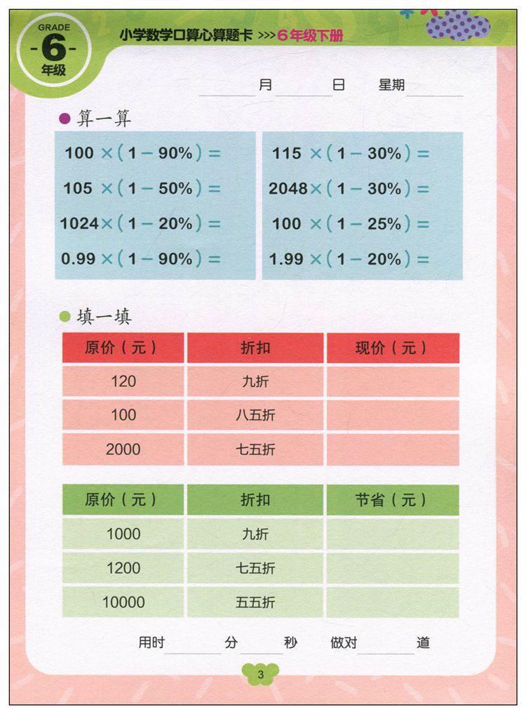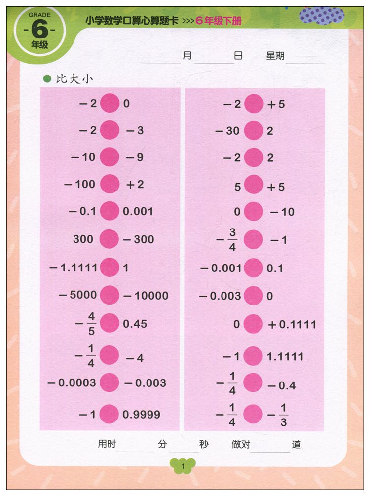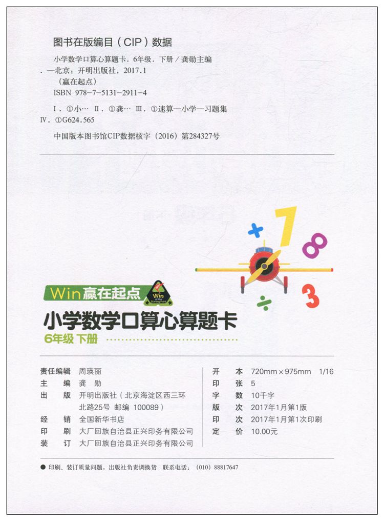六年级下册下学期课外作业练习题 全新正版 小学数学心算口算题卡6 人教版 家长孩子多题练习 Win赢在起点