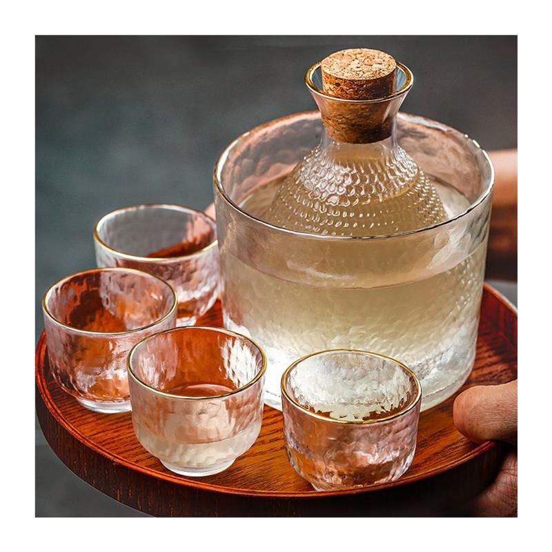 温酒壶家用烫酒日式 酒盅酒杯白一 锤纹金边玻璃清酒黄酒温酒器套装