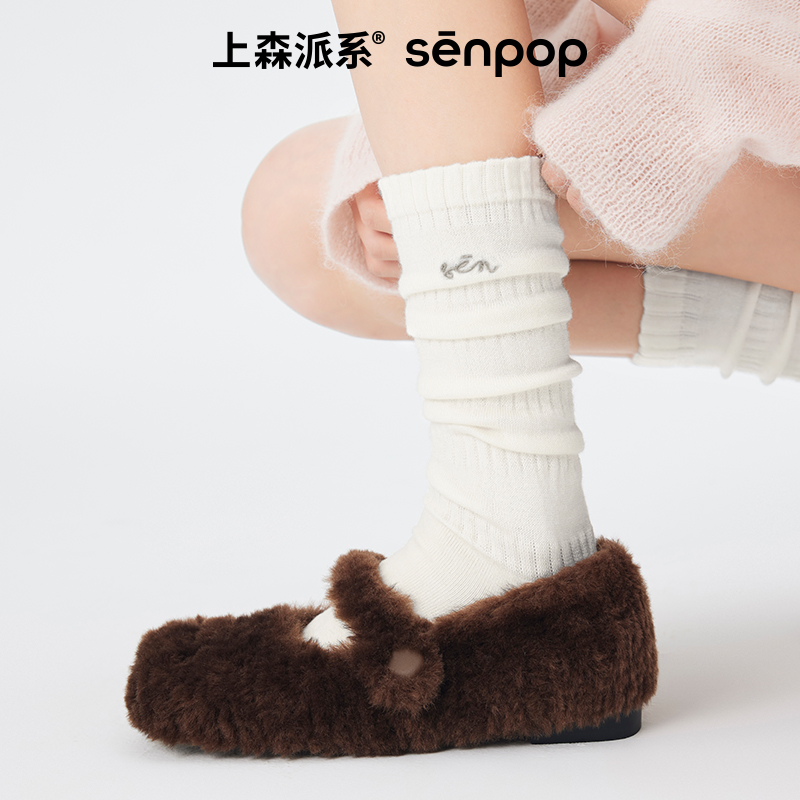 棕咖色月子长袜 乐福鞋 木耳边堆堆袜子女秋冬季 纯棉中筒袜配小皮鞋