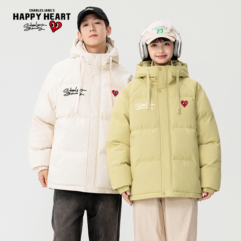 查尔斯桃心假两件冬季 拼接多巴胺情侣加厚保暖连帽棉服外套男 新款