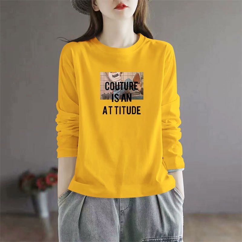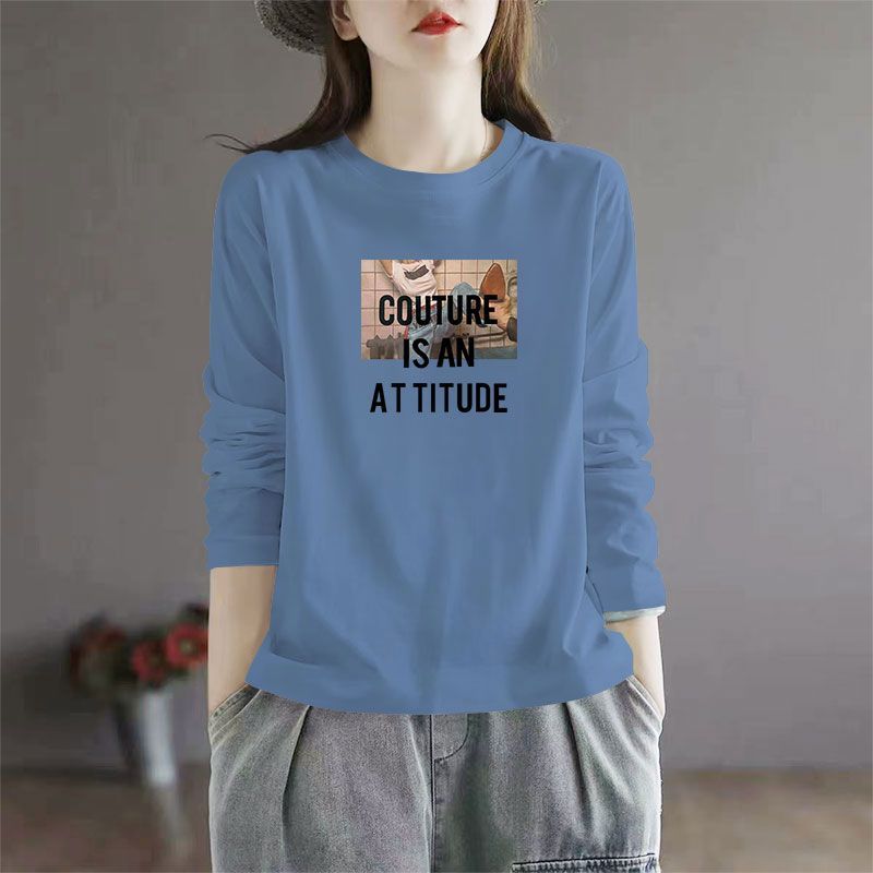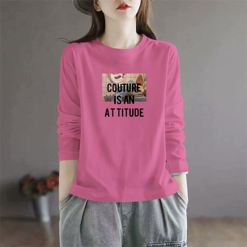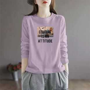 春秋通勤100%纯棉长袖 洋气潮流百搭宽松显瘦上衣服 圆领T恤女时尚