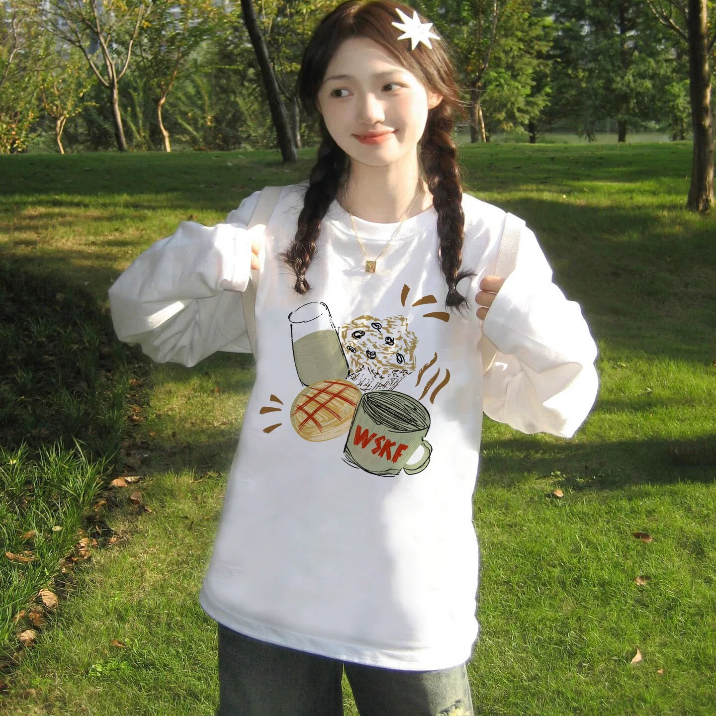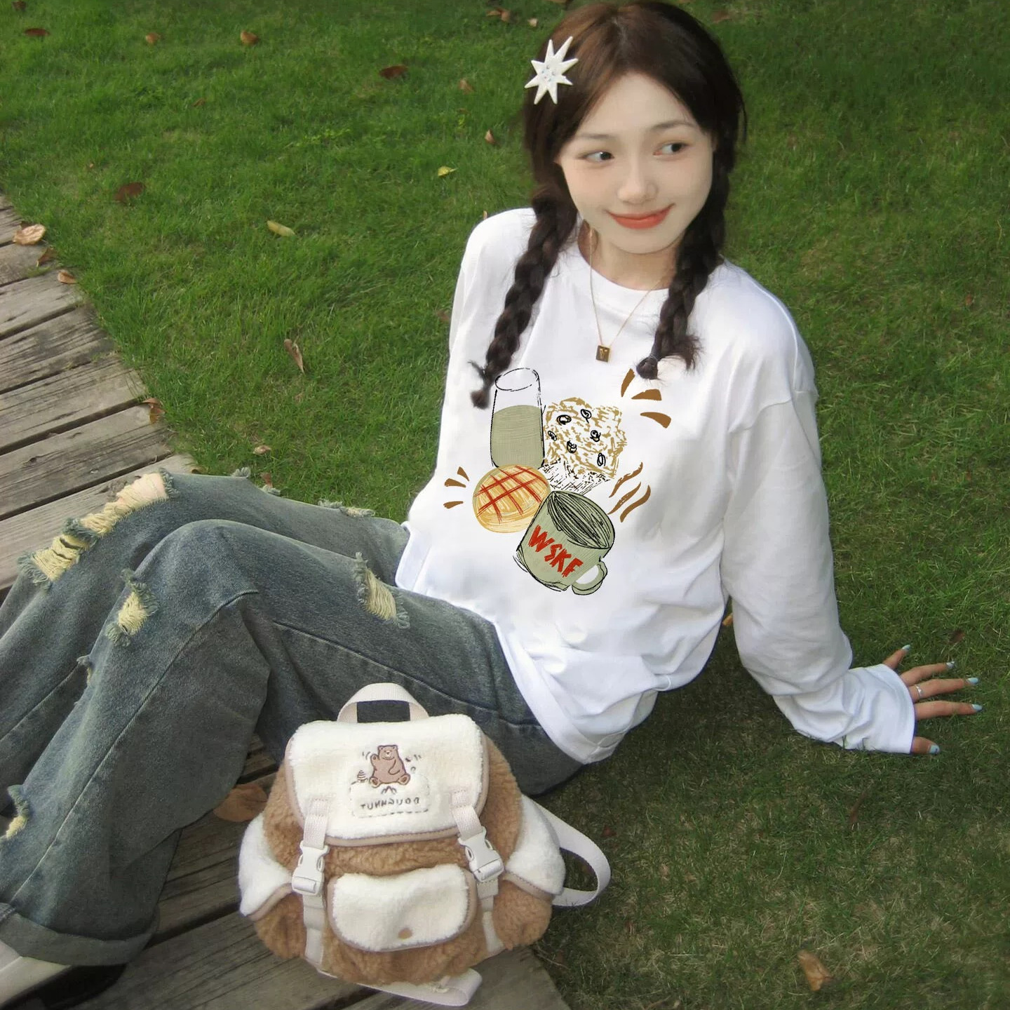 上衣 2025早秋新款 白色纯棉长袖 t恤女内搭圆领卫衣正肩宽松打底衫