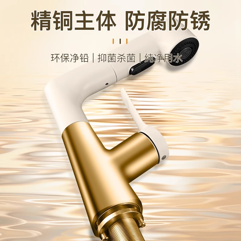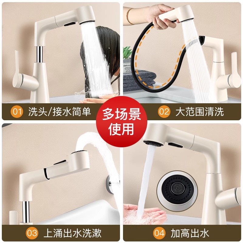 洗脸盆水龙头抽拉式 冷热面盆洗手盆卫生间浴室台盆奶油风升降家用